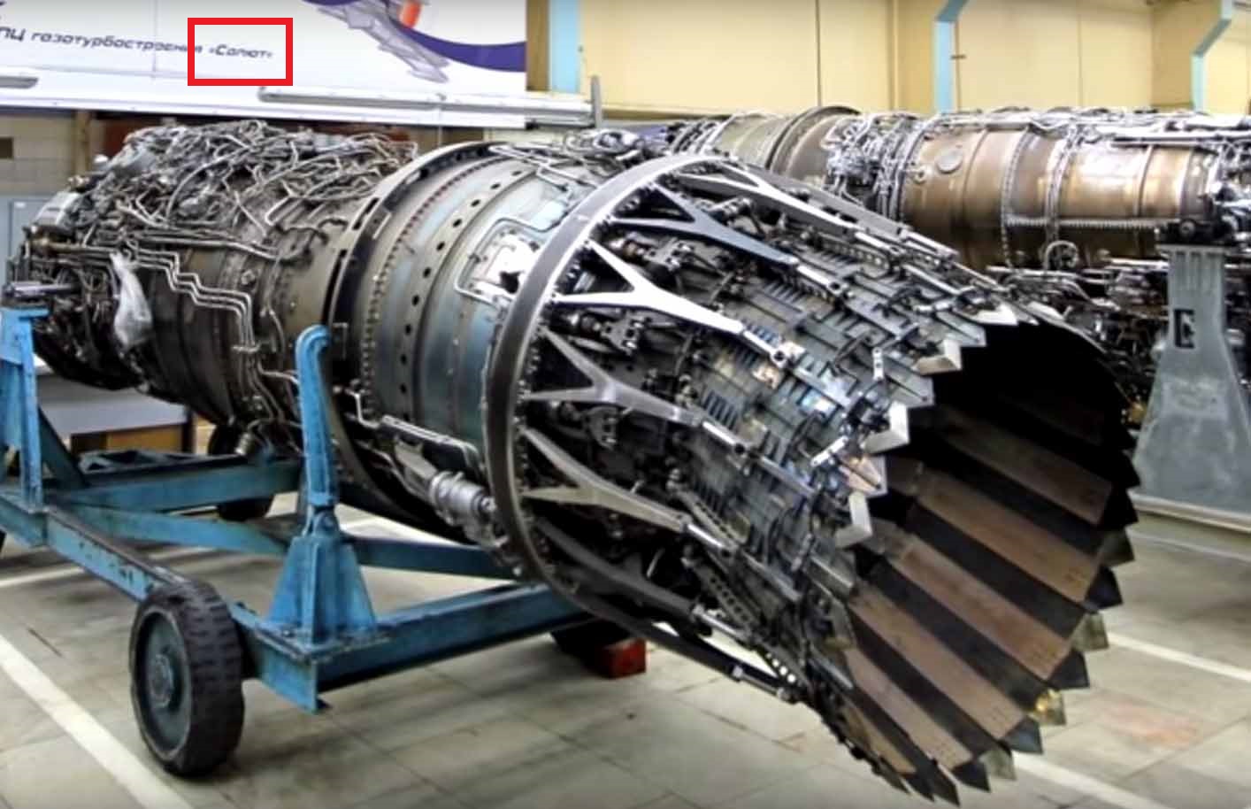 V pozadí motora stojí v červenom rámčeku САЛЮТ, po našom Saľut