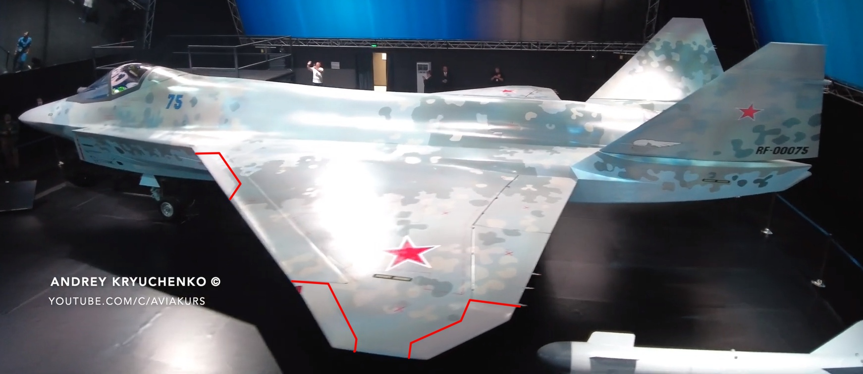 Dokonce bych si dovolil tvrdit, že to křídlo je identické s tím na Su-57 (jestli rozměry, to chce prověřit, ale mohlo by být) - stejné tvary, stejné tvary náběžné hrany a ovládacích prvků křídel, stejný počet a rozmístění 3ks vybíječů statické elektřiny na koncích křídel.