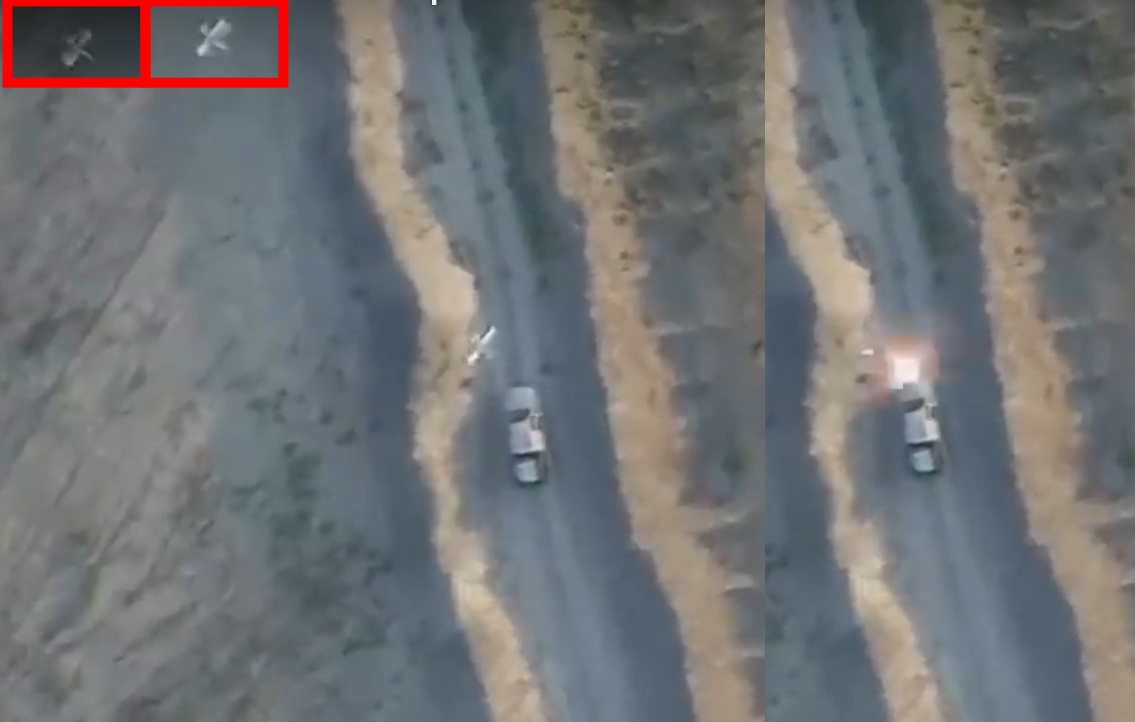Aj v 0:54 zasahuje ten bunker niečo s krídlami, vidno tomu tieň krídiel na zemi. Tak lancet to nebude. Myslím že som videl ešte jeden samovražedný dron od Kalašnikova, ale ten mal skosené krídla, toto ich má priame, ak dobre vidím.