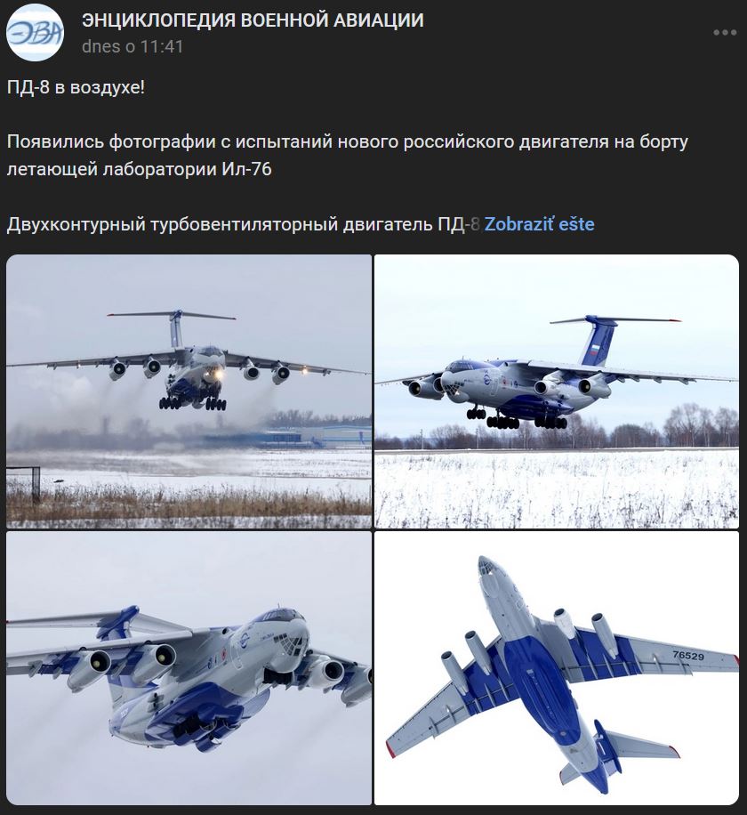 Objavili sa fotografie z testov nového ruského motora PD-8 (ПД-8) na palube lietajúceho laboratória IL-76LL (Ил-76ЛЛ). Dvojprúdový turboventilátorový motor PD-8 (ПД-8), ktorý bude použitý na osobných lietadlách SSJ-NEW a na hydropláne Be-200 (Бе-200), sa vyvíja a vyrába s použitím najnovších ruských materiálov a moderných technológií vrátane 3D tlače. Práca zahŕňa širokú spoluprácu podnikov ODK a aktívne využíva skúsenosti získané pri vývoji a výrobe motora PD-14 (ПД-14). Zdroj https://vk.com/wall-173678697_303885 z 26.12.2022 + kvalitnejšie foto