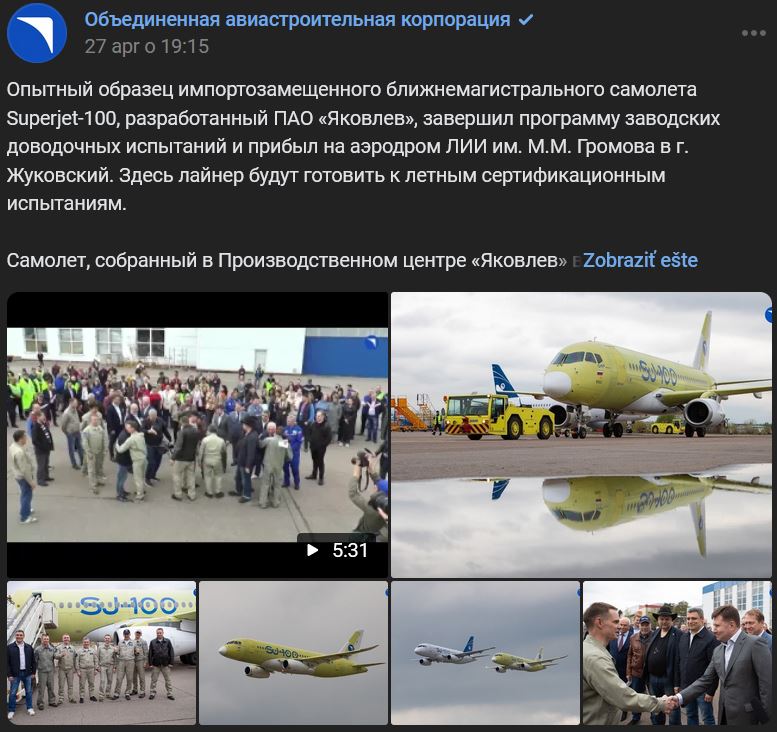 Prototyp lietadla Superjet-100 na krátke vzdialenosti s náhradou dovážaných komponentov, ktorý vyvinula spoločnosť PAO Jakovlev (Яковлев), ukončil program záverečných továrenských skúšok a dorazil na letisko LII Gromova (ЛИИ им. М.М. Громова) v Žukovskom. Tu sa dopravné lietadlo pripraví na letové certifikačné skúšky. Lietadlo zmontované vo výrobnom stredisku Jakovlev v Komsomoľsku na Amure dorazilo do Žukovského po prelete celkovej vzdialenosti približne 6000 km s medzipristátím na novosibírskom letisku Tolmačevo (Толмачево).