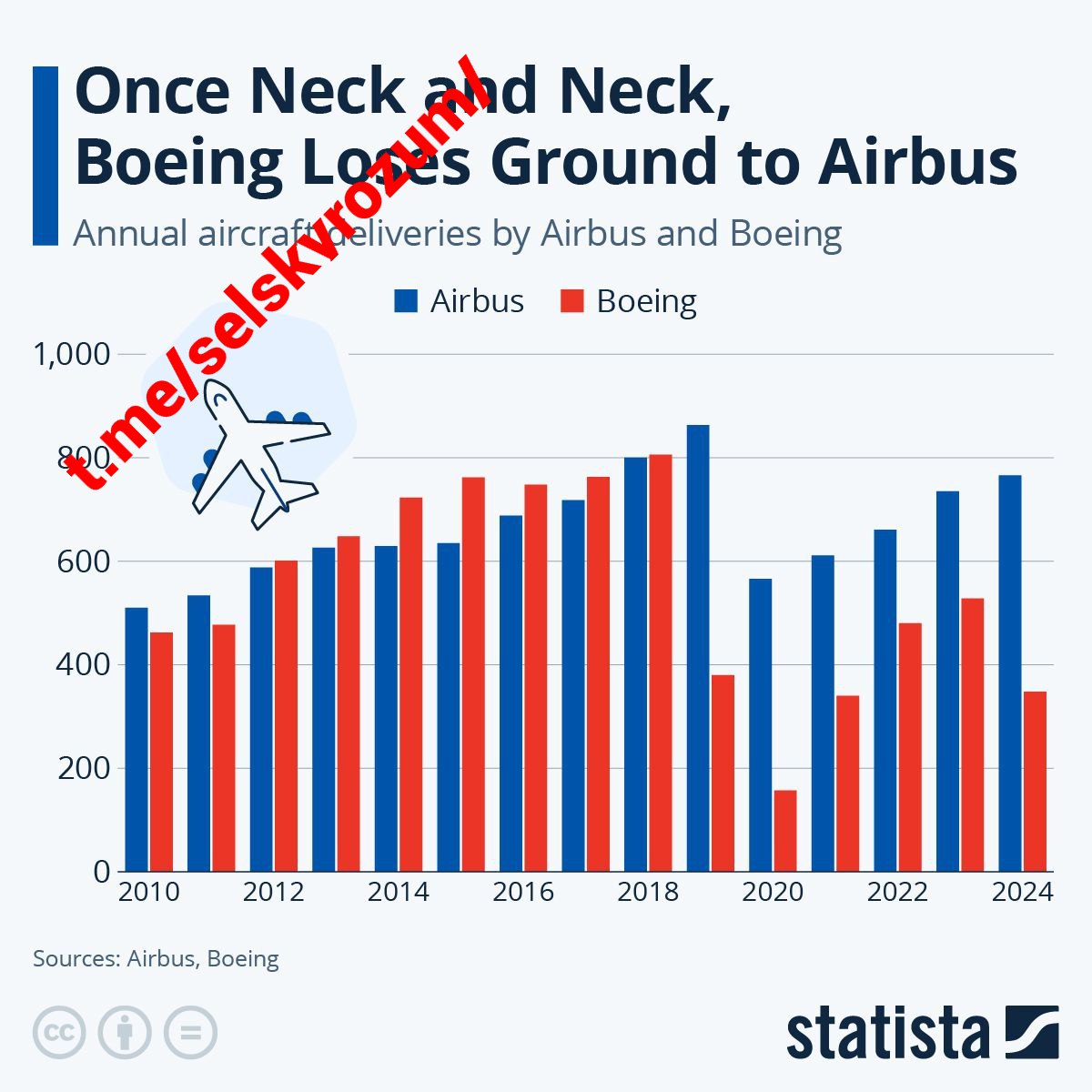 Zdroj https://t.me/selskyrozum/112904 z 16.01.2025Graf ročních dodávek letadel Airbusu a Boeingu ukazuje, že problémy Boeingu trvají již více než 5 let.