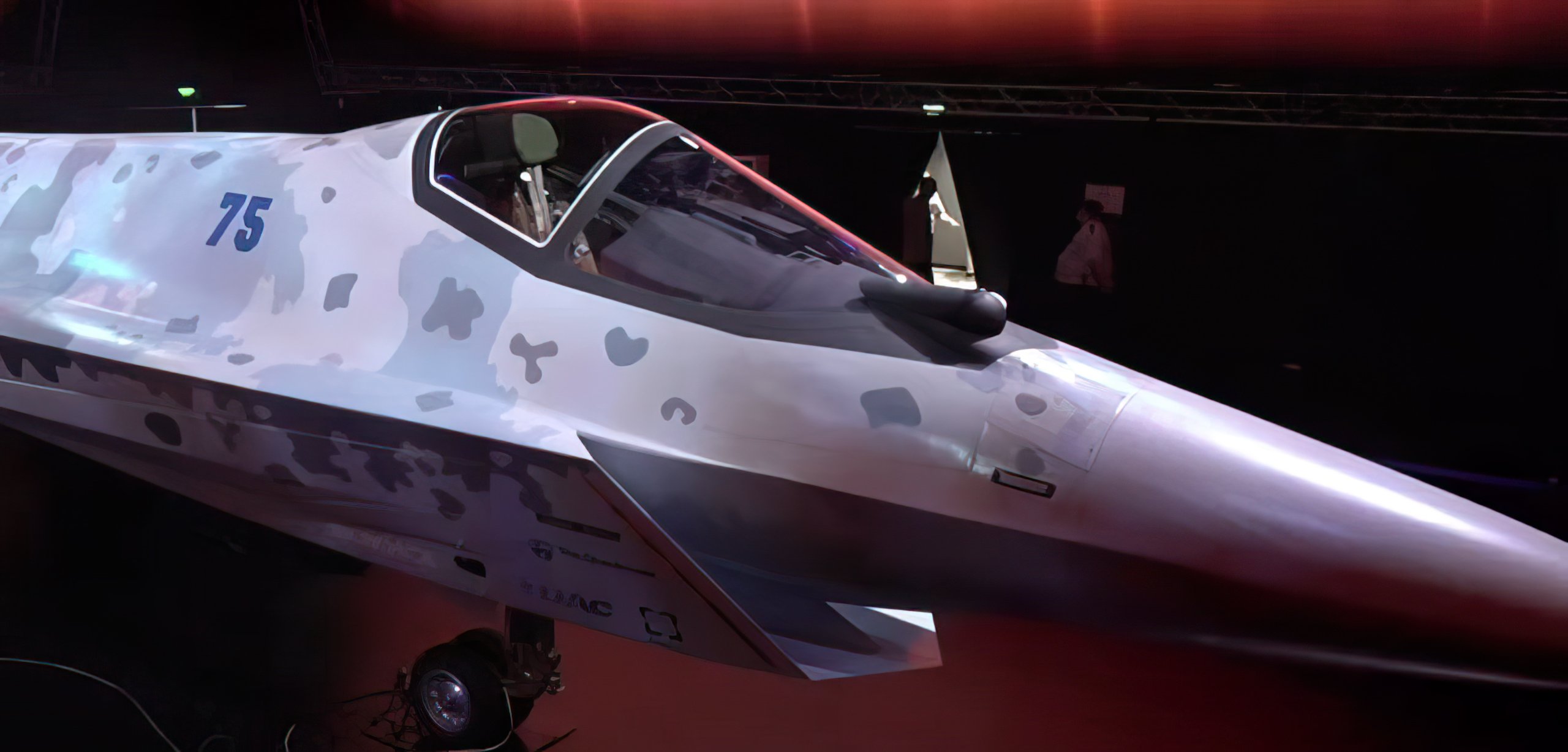 Zdá se mi toto podivné, podle těch detailů na "stroji" v hale (včetně HUDu v kabině a jeho příslušenství (ty krabice před ním) a dalších mikro detailů, které by jste na hrubou maketu nedávali - proč?, jako poziční světla a tak) bych se vsadil, že to bude přesně obráceně - venku bude stát jen hrubá "bakelitová" maketa pro návštěvníky, kdy v hale stojí druhý neletový prototyp: T-75-KNS alias integrovaný zkušební stend (KNS) pro pozemní testování, čemuž by to množství mikro detailů odpovídalo.Vypadá to, že ve výstavní hale je pouze maketa, zatímco venku na ploše pod plachtou je skutečné letadlo