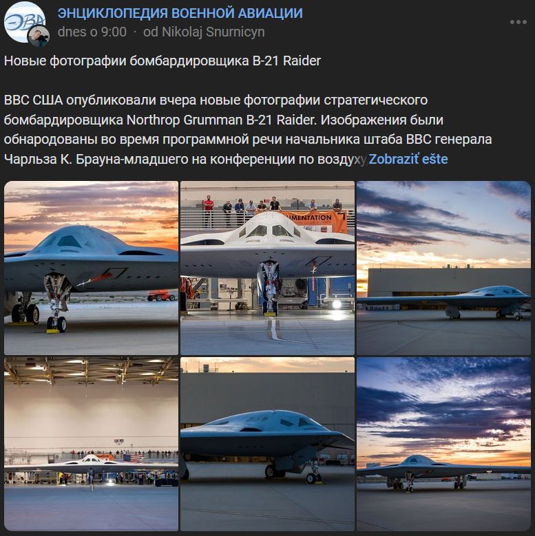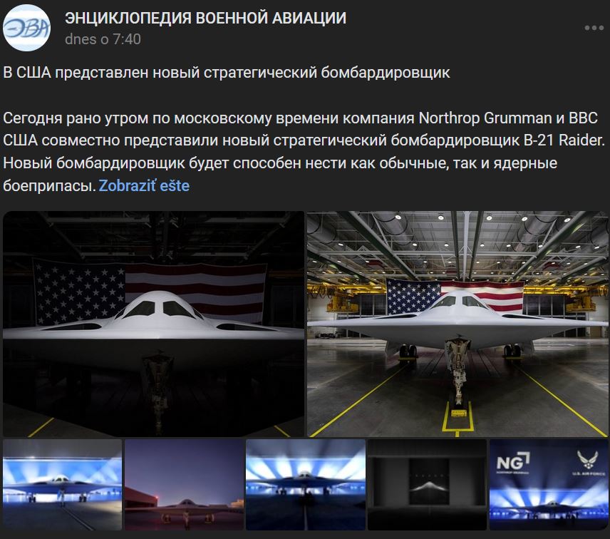 Dnes skoro ráno moskovského času spoločnosť Northrop Grumman a VVS SŠA spoločne predstavili nový strategický bombardér B-21 Raider. Nový bombardér bude schopný niesť konvenčné aj jadrové hlavice. Nový bombardér pre VVS SŠA po viac ako 30 rokoch "vyzerá pôsobivo, ale to, čo je vo vnútri a pod rúškom kozmickej éry, je ešte pôsobivejšie," povedal minister obrany Lloyd Austin. "Dokonca ani tie najsofistikovanejšie systémy PVO nebudú schopné odhaliť B-21 na oblohe," dodal Austin. Prezident divízie leteckých systémov spoločnosti Northrop Grumman Tom Jones, uviedol, že technológia s nízkou detekciou, použitie otvorenej architektúry a technológie JADC2 (Joint All-Domain Command and Control) umožňujú zaradiť B-21 medzi lietadlá 6. generácie. Dnes predstavený B-21 je prvým testovacím modelom. Na palube má číslo 001 a písmeno ED, ktoré označuje pridelenie na leteckú základňu Edwards. 5 ďalších lietadiel B-21 je v rôznych štádiách výroby. Prvý let B-21 sa uskutoční v roku 2023 po ukončení série pozemných testov.