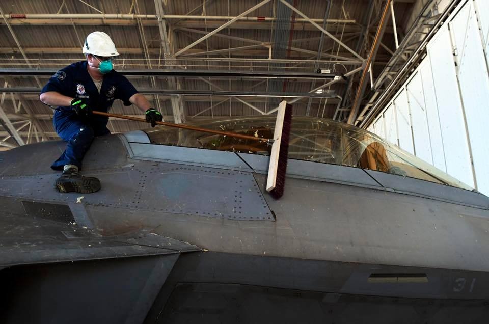 Podľa neho ich stačí len očistiť a budú pripravené opäť lietať .. ale BOZP nadovšetko = technik pri zametaní lístia z "nebezpečného" povrchu F-22 musí mať rúško. Všimnite si koľko rukavíc má na opasku = na rôzne diely povrchu iný typ rukavíc ...