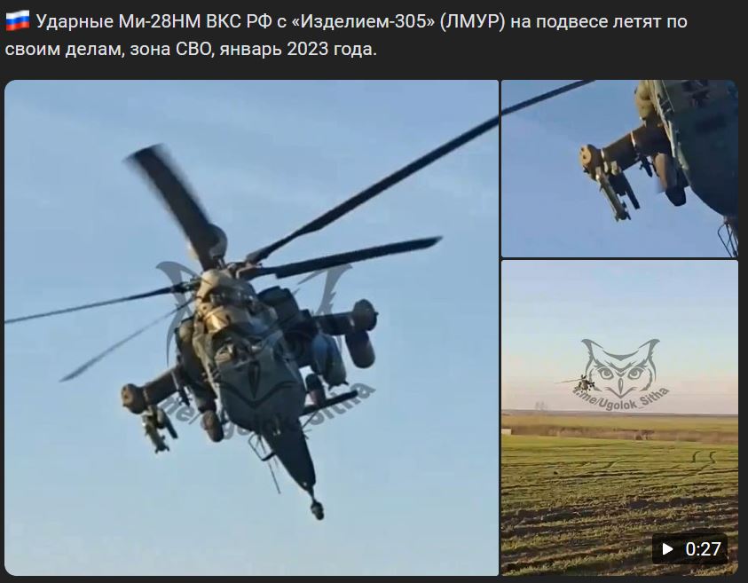Bojový vrtuľník Miľ Mi-28NM (Ми-28НМ) VKS RF s podveseným Výrobok-305 (Изделие-305)/LMUR (ЛМУР) letí po svojich cieľoch, zóna ŠVO, 01/2023.