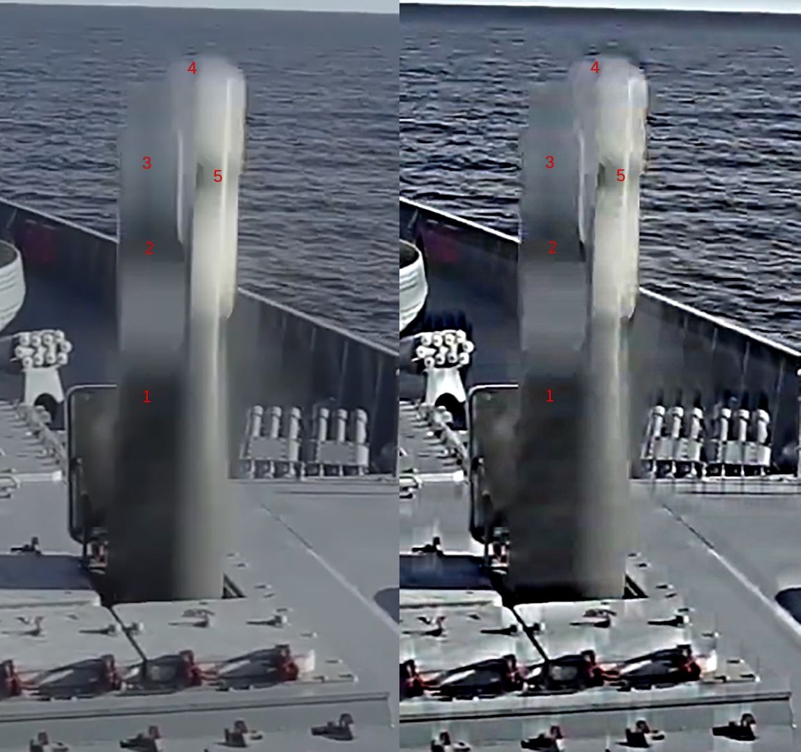 Už jsem na to přišel, kde je sání vzduchu do scramjetu a jakou to má konstrukci na Zirkonu.. dejte mi půl hodiny, zatím jen přihodím fotku zas protaženou filtrem na doostření pohybového směrového rozmazání, všimněte si, že ten bílý materiál je i někde jinde než jen na "špici" (i když na té odvrácené straně je ho teda mrtě) a důvod proč tam je souvisí s tím, co tu píšu, že jde o nějaký ablativní materiál a aerodynamické zaslepení sacího ústrojí scramjet komory a lamače rázové vlny (a dalšího zařízení tam, kde je ho opravdu hodně) dokud je střela urychlovaná jen pomocí raketového motoru na TPH na minimální rychlost M4 (což se uvádí jako minimální rychlost pro zážeh scramjet motoru) a jelikož je to prudké zrychlení v řádu desítek G, tak aerodynamický ohřev není pozvolný, ale defakto raketový v této fázi letu a tomu brání tím bílým materiálem, který se pravděpodobně začne rychle odpařovat až v řídkých vrstvách atmosféry a velkých výškách (+10km minimálně) po dosažení letové rychlosti střely M4-5-6 za pomoci raketového motoru. Popisky doplním, a ještě tam něco domaluji, aby to bylo zřejmé..
