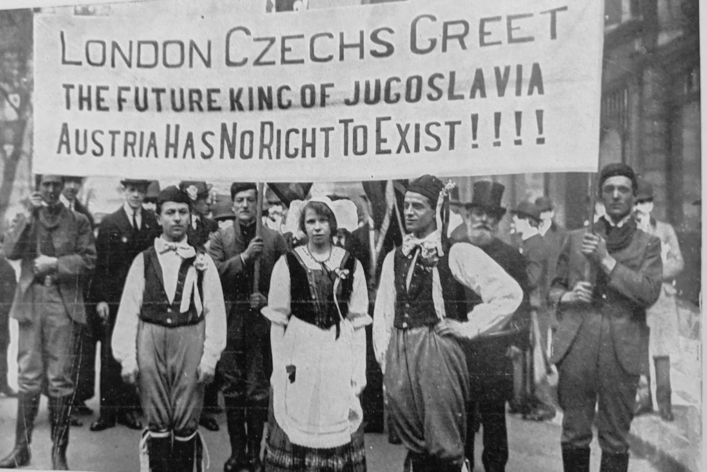 „Rakousko nemá právo existovat“ – Češi demonstrovali proti Rakousku-Uhersku v Londýně během návštěvy prince Alexandra Srbského v roce 1916.