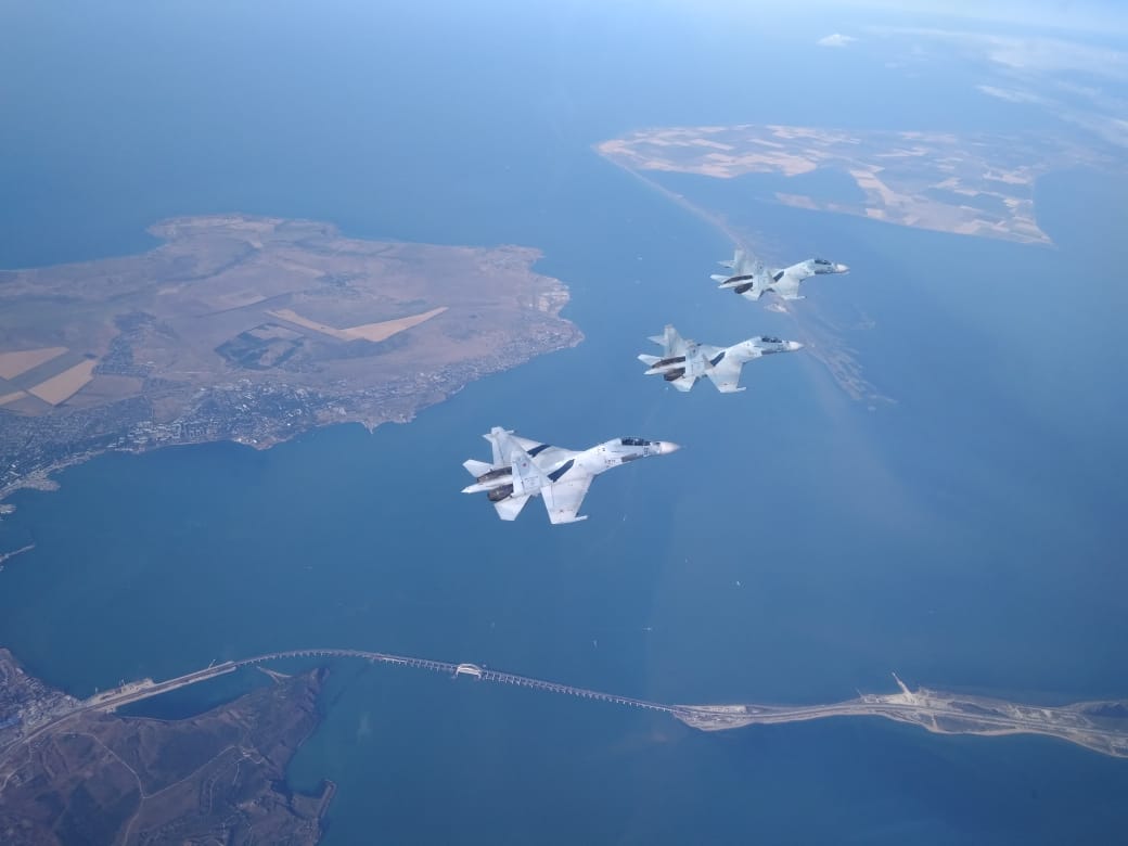 3x Suchoj Su-30 na Krymským mostom - smer letu z Krymu na kontinent, hore Sever = Azovské more