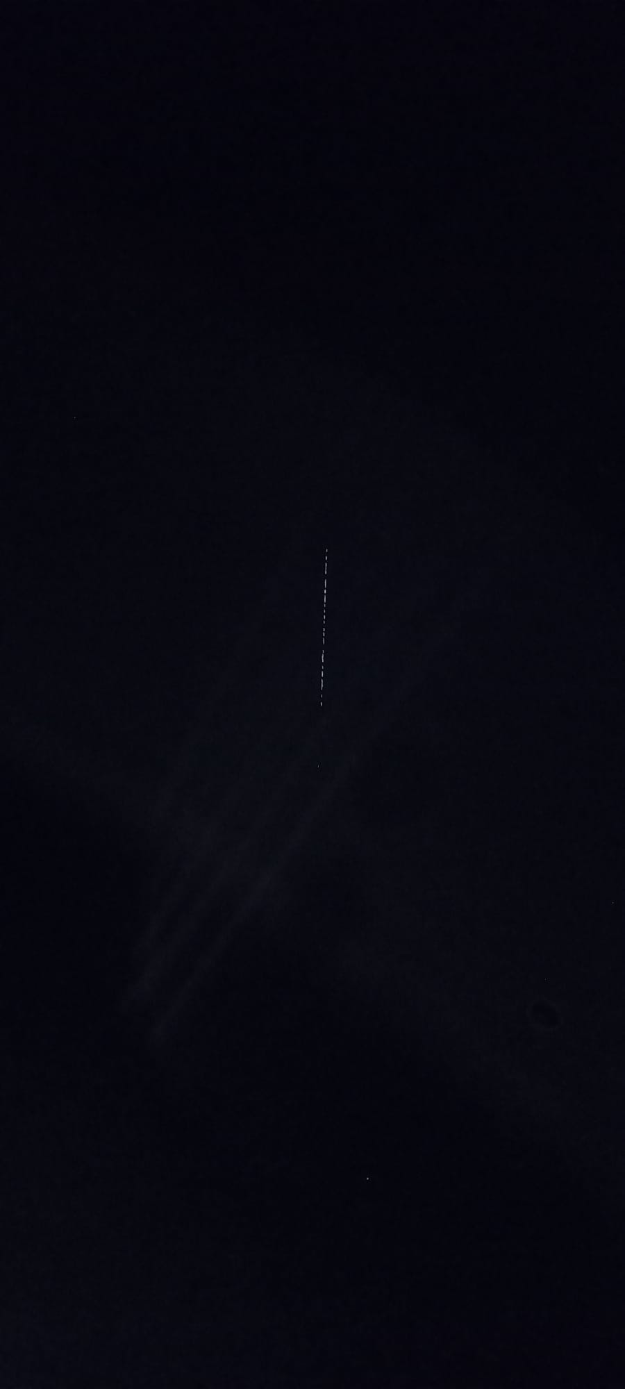 Včera večer na Vysočině okolo 18.00 letělo něco co je na fotce směrem od západu na východ. Nebyl slyšet žádný zvuk, Asi tak za půl minuty to přeletělo od obzoru až ke mě nad hlavu a pak to zhaslo. Velikost a výšku vzhledem k tomu že byla tma se nedalo určit. Můj subjektivní odhad asi tak 500 m výška a 50 m délka. Bylo to celý divný. Pokud rozklinete obrázek, tak ten skoro neznatelný svítíci bod pod těmi co jdou za sebou k tomu patřil taky.
