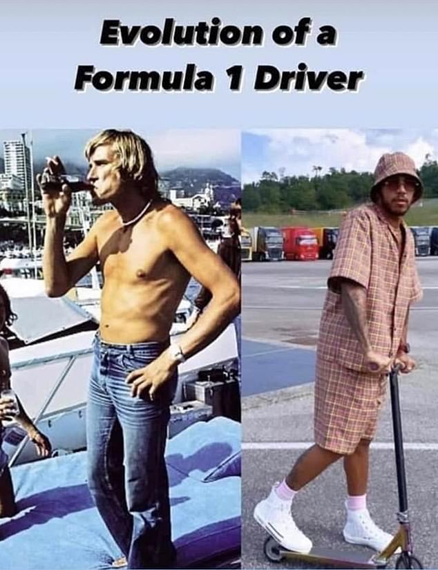 Bohužel se mi nepodařilo najít původní vtip s Hamiltonem, kde je v růžovém buznička overallu na koloběžce a proti němu alfa samec/pilot F1 ze 70. let. Výrazy ve tvářích ilustrují mnohé.