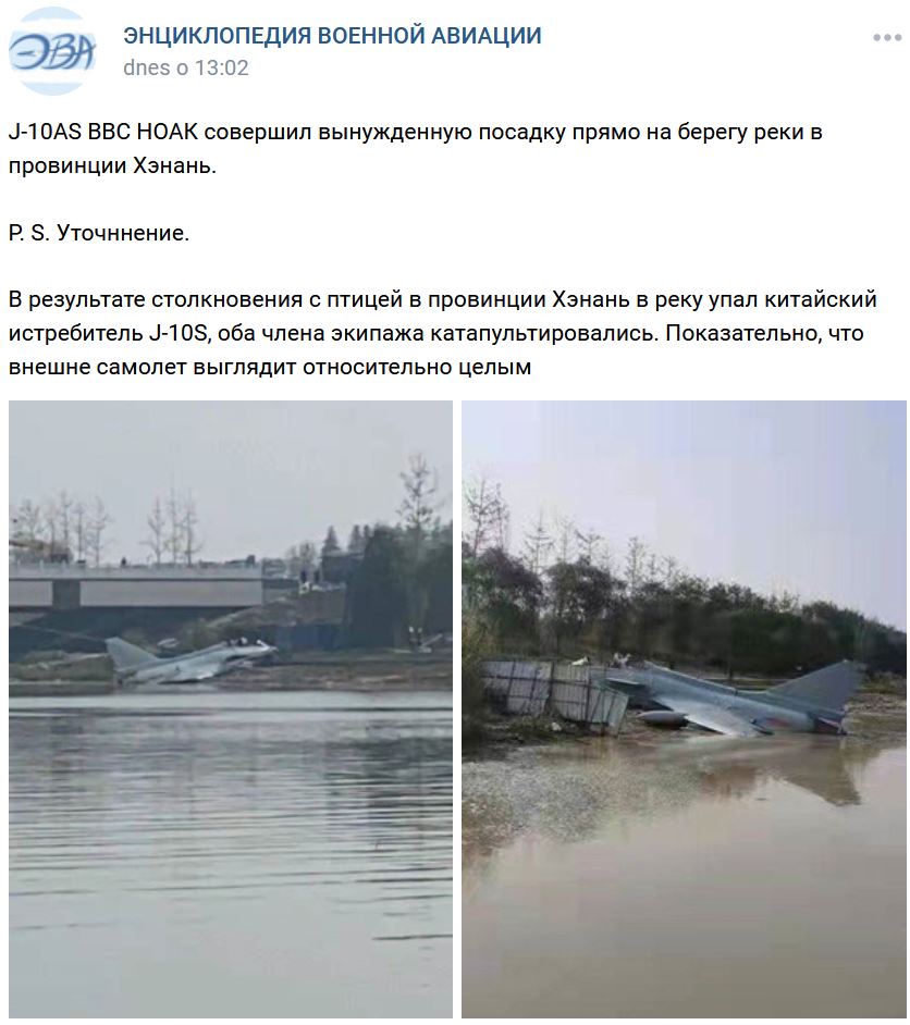 Lietadlo J-10S spadlo do rieky v dôsledku zrážky s vtákom v provincii Henan, obaja piloti sa katapultovali. Lietadlo sa zvonku javí ako relatívne neporušené.