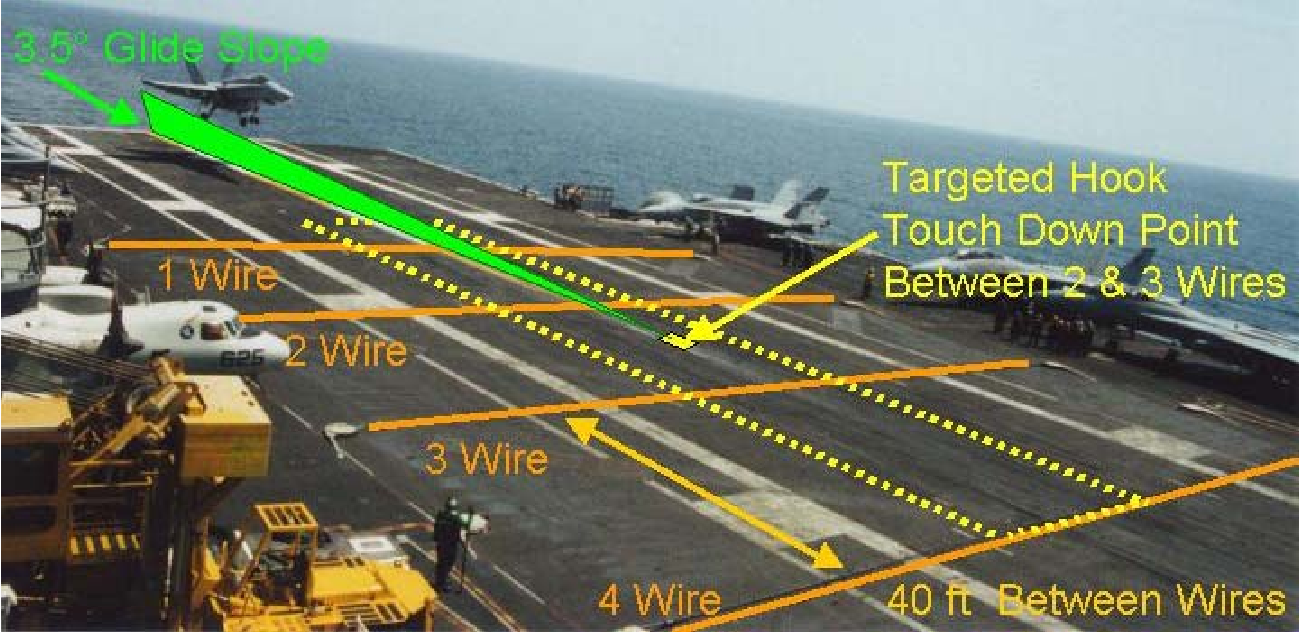 Chyba pilota - laná na palube sú až 3-4 dĺžky lietadla od konca/začiatku paluby, takže lietadlo musí byť celé nad palubou a až potom má mašina sadnúť dole by chytil 1 zo 4 lán svojim hákom = preto majú NAVY lietadlá poriadny podvozok lebo to o palubu niektorý poriadne tresnú