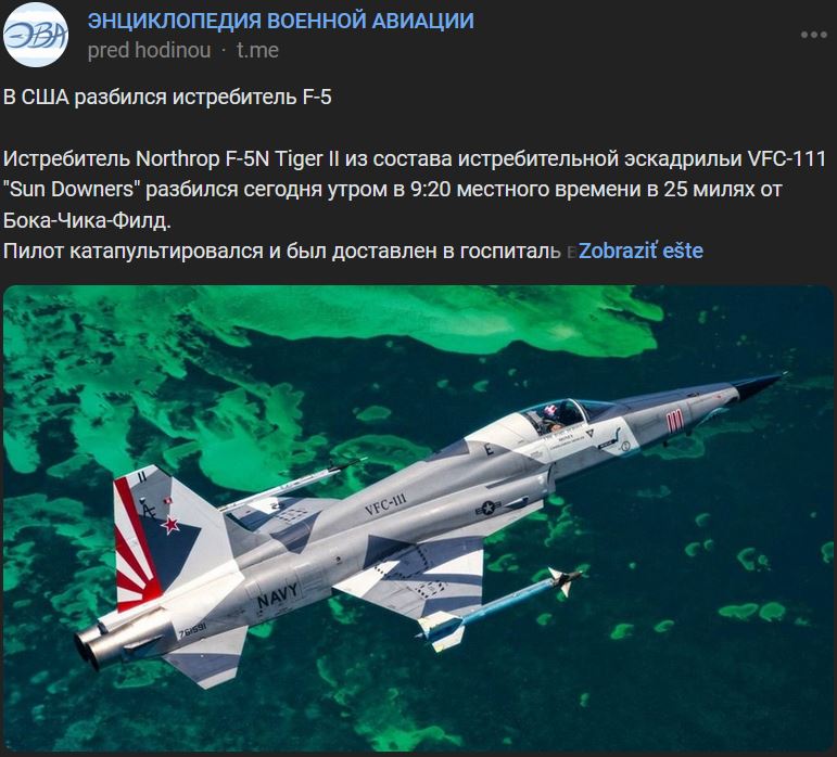 Lietadlo Northrop F-5N Tiger II zo stíhacej letky VFC-111 Sun Downers sa v stredu 31.05.2023 ráno o 09:20 hod. miestneho času zrútil 25 míľ od Boca Chica Field. Pilot sa katapultoval a bol prevezený do nemocnice v Miami na ďalšie vyšetrenie. 111. stíhacia letka VMS SŠA so sídlom na námornej stanici Key West na Floride cvičí pilotov VMS SŠA (US Navy (USN)) tak, že hrajú úlohu agresorov (vydávajú sa za nepriateľa) - preto sú na lietadlách letky červené hviezdy. Zdroj https://vk.com/wall-173678697_326211 / https://t.me/AviaCT/21599 z 31.05.2023