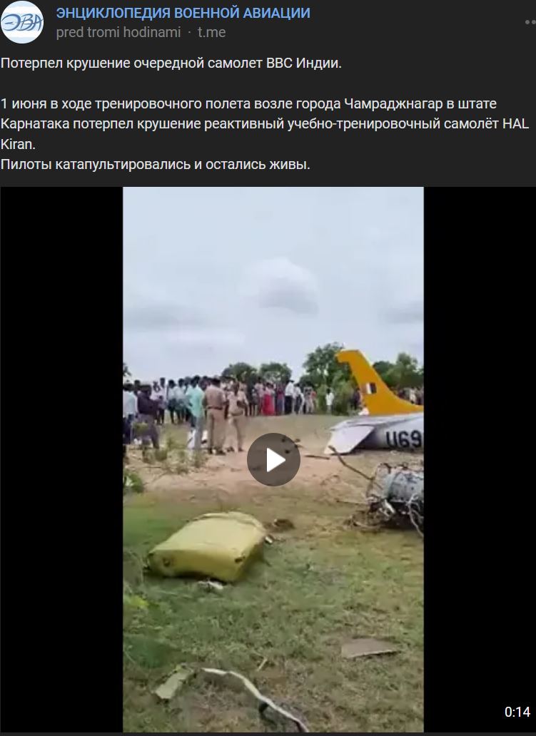 Cvičné prúdové lietadlo HAL HJT-16 Kiran sa 01.06.2023 zrútilo počas cvičného letu neďaleko mesta Chamrajnagar v štáte Karnataka.Piloti sa katapultovali a prežili. Video https://vk.com/video-173678697_456242750 dĺžka 14 sek.
