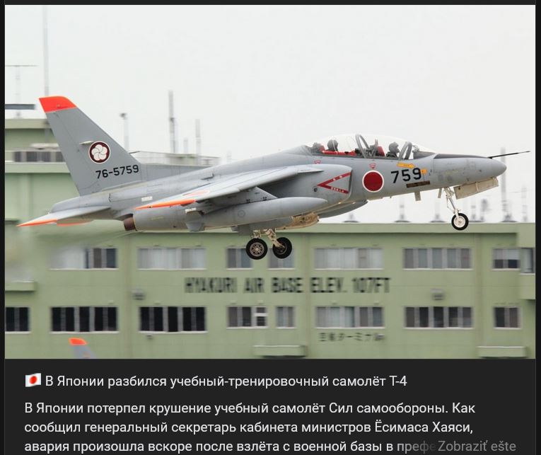 V Japonsku havarovalo cvičné lietadlo Síl sebaobrany. Podľa generálneho tajomníka kabinetu Jošimasa Hajashiho k havárii došlo krátko po štarte z vojenskej základne v prefektúre Aiči v centrálnej časti krajiny. Podrobnosti zatiaľ neboli zverejnené, ministerstvo obrany zhromažďuje informácie. Podľa NHK lietadlo Kawasaki T-4, ktoré okolo 15:00 hod. miestneho času vykonávalo cvičný let, spadlo do jazera neďaleko mesta Inujama. Na palube sa podľa predbežných údajov nachádzali 2 osoby. Lietadlo údajne patrilo 305. letke 5. leteckého krídla so základňou na leteckej základni Nyutabaru.
