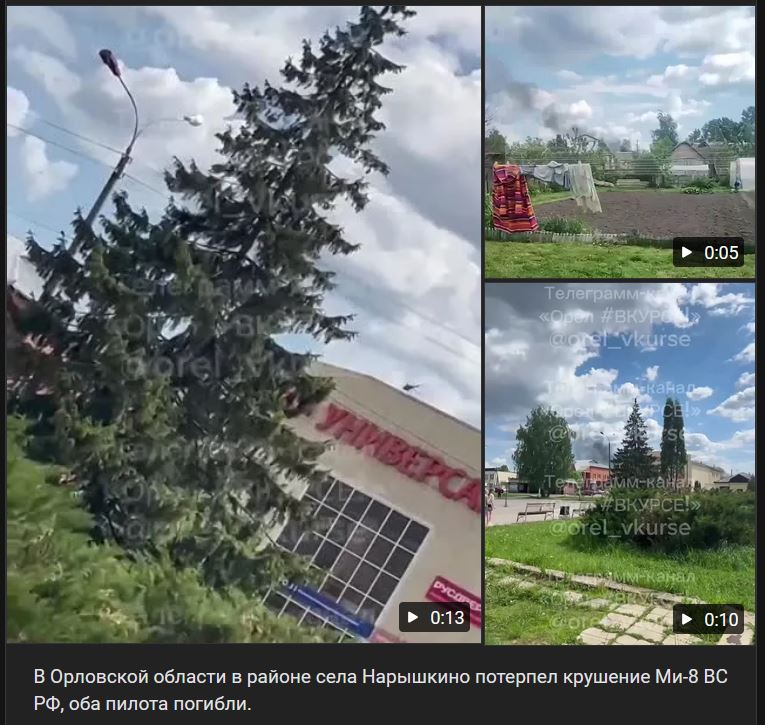 V Orlovskoj oblasti pri obci Naryškino (Нарышкино) sa zrútil vrtuľník rodiny Miľ Mi-8 (Ми-8) VS RF, obaja piloti zahynuli.
