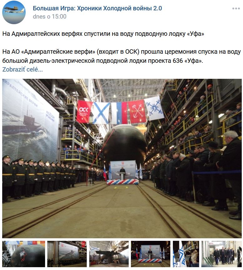 V Petrohrade v Admiraltejskij lodeniciach (Адмиралтейские верфи) na vodu spustili D-E ponorku projektu 636 pomenovanú po meste "Ufa". Ponorka je hotová na 90%, po úplnom dokončení sa začnú závodné testy. "Ufa" je 4. ponorka projektu 636 pre TOF, založená v 10/2019. V lodenici prebieha výroba na 5. ponorke pre TOF "Možajsk" (Можайск) a na 6. ponorke "Jakutsk" (Якутск) Zdroj https://www.aoosk.ru/press-center/news/ ... lodku-ufa/ + klon https://vk.com/wall-104764077_310338 z 31.03.2022 + viac foto