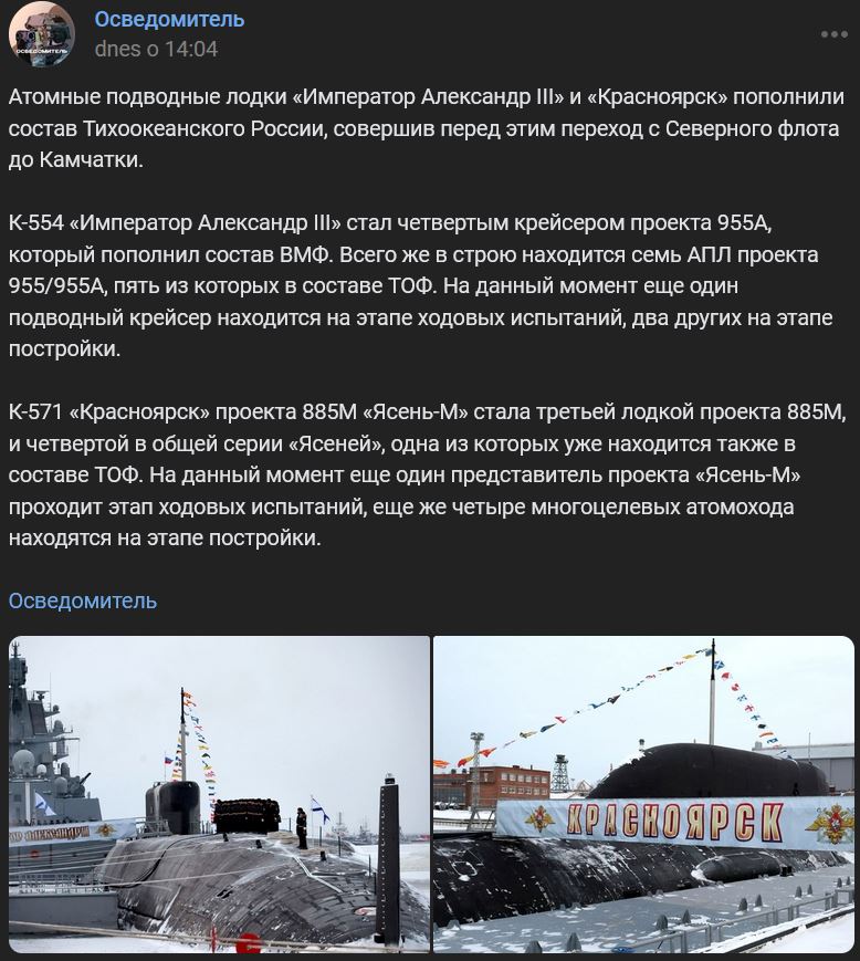 Ponorky s jadrovým pohonom „Imperator Aleksandr III“ (Император Александр III) a „Krasnojarsk“ (Красноярск) sa zaradili do zostavy Tichooceánskej flotily Ruska, keď predtým boli preradené zo Severnej flotily na Kamčatku.