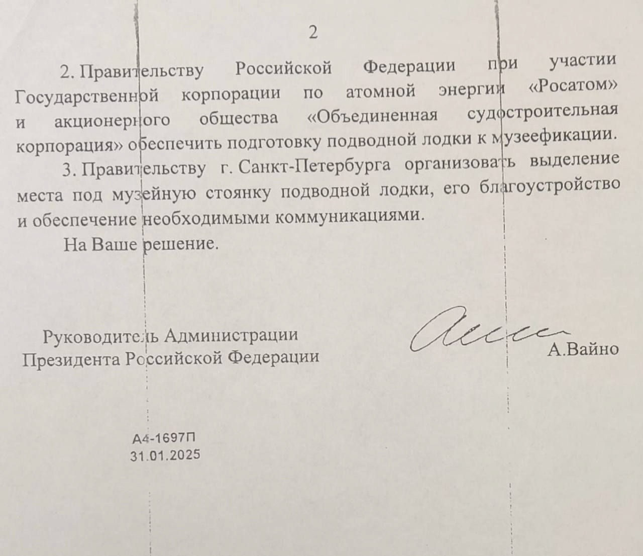Na internete sa objavil dokument podpísaný vedúcim prezidentskej administratívy A. E. Vajno (А. Э. Вайно) o muzealizácii A-ponorky TK-208 Dmitrij Donskoj (ТК-208 Дмитрий Донской) projektu 941 Akula
