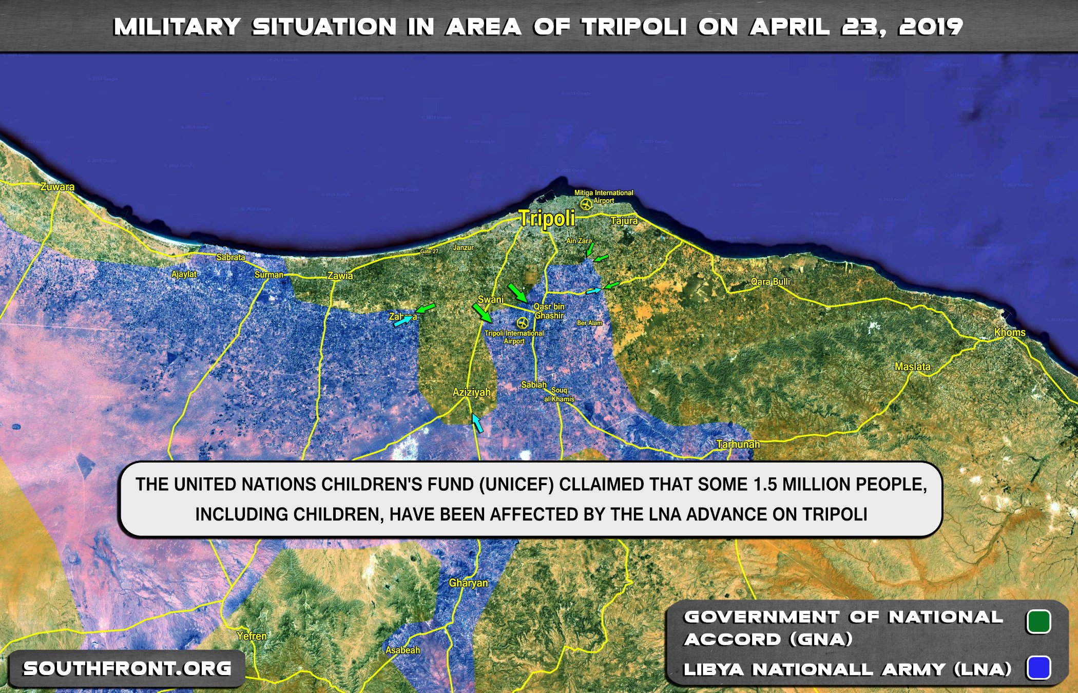 Libyjská národní armáda (LNA) vyvíjí svůj pokrok ve městě Tripolis, který je v rukou vlády národní dohody (GNA). Navzdory rozvinutým silám LNA dosud nedokázala v této oblasti dosáhnout významného pokroku. Nejintenzivnější boje v současné době probíhají v oblasti mezinárodního letiště v Tripolisu, kde síly GNA zahájily několik protiútoků. Pokud je LNA schopna přinést ránu silám GNA v této oblasti a zkrátit frontovou linii jihozápadně od Tripolisu, mohla by být schopna překonat odpor GNA.