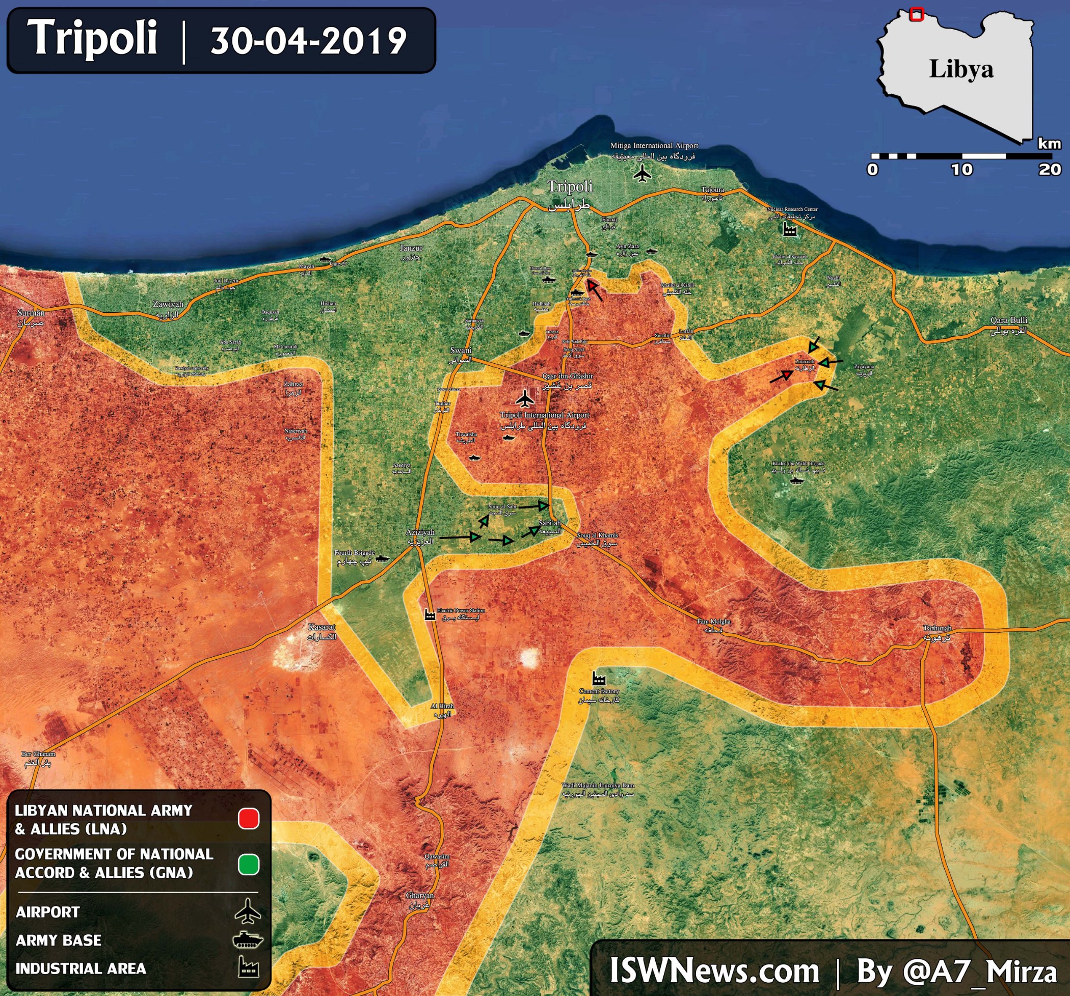 Jednotky libyjské národní armády (LNA) přerušily cestu mezi městem Aziziyah a Tripolisem, podle zdrojů pro-LNA. Město Aziziyah patří mezi klíčové obranné pozice sil loajálních vládě národní dohody (GNA), která kontroluje hlavní město země, Tripolis. V oblasti téměř od samého začátku postupu LNA na Tripolis probíhají střety s různou intenzitou. Pokud se zdá, že LNA dokáže tuto oblast obklíčit a získat, síly GNA ztratí důležitý bod své obrany jižně od hlavního města. https://southfront.org/libyan-national- ... ipoli-map/