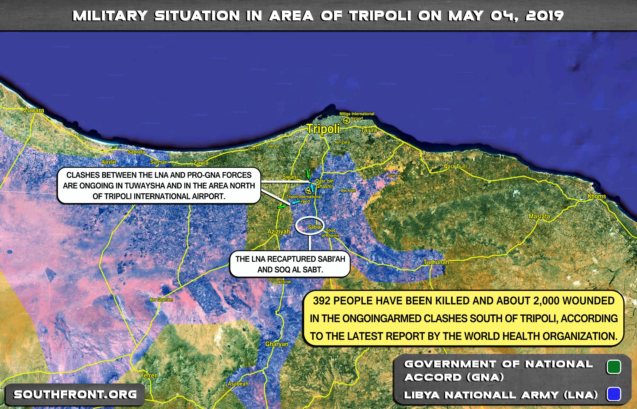 Podle nedávné zprávy Světové zdravotnické organizace bylo při probíhajících ozbrojených střetech jižně od Tripolisu zabito 392 lidí a přibližně 2000 zraněno. https://southfront.org/military-situati ... ap-update/