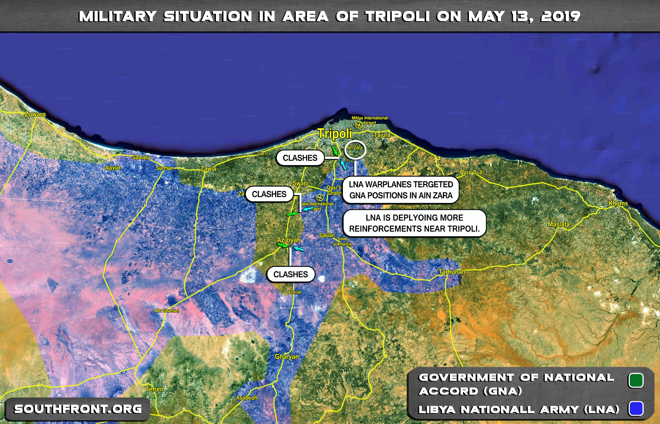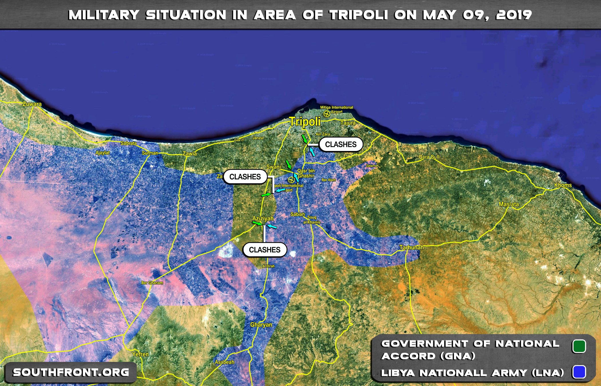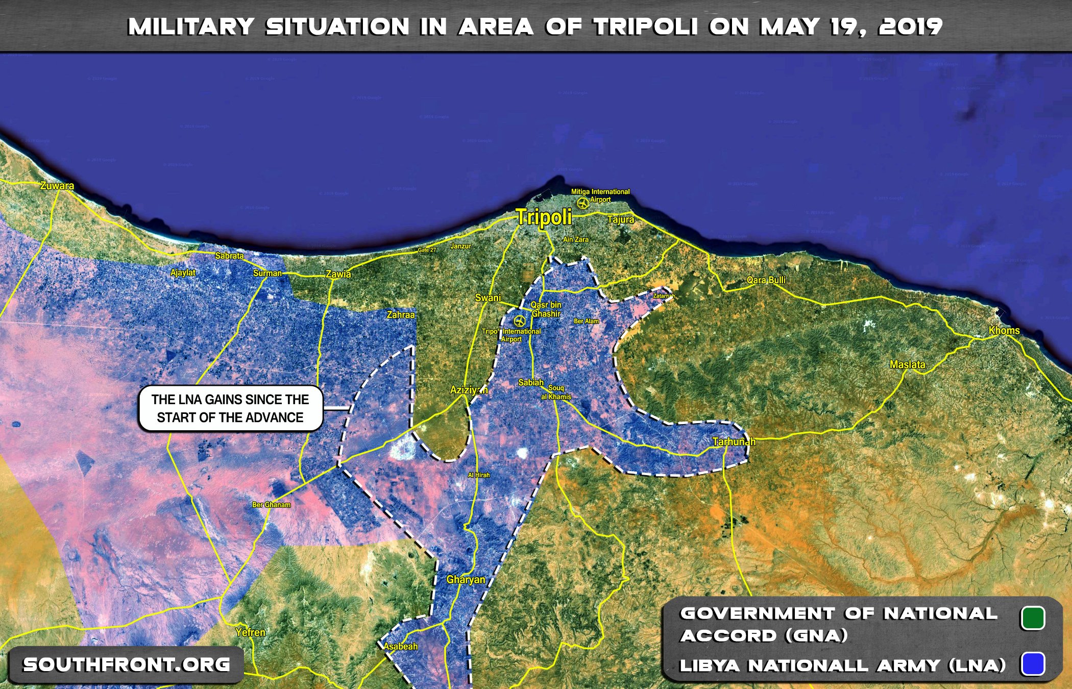 Síly vlády národní dohody (GNA) pokračují ve svých pokusech zastavit postup Libyjské národní armády (LNA) jižně od Tripolisu. Podle posledních zpráv probíhají střety mezi LNA a GNA v blízkosti Ain Zara, mezinárodního letiště Tripoli a Azaziyah. Swani zůstává klíčovou pevností GNA jihozápadně od Tripolisu. Pokud padne do rukou LNA, celá fronta GNA na jihozápadně by se mohl během několika dnů zhroutit. https://southfront.org/military-situati ... -2019-map/