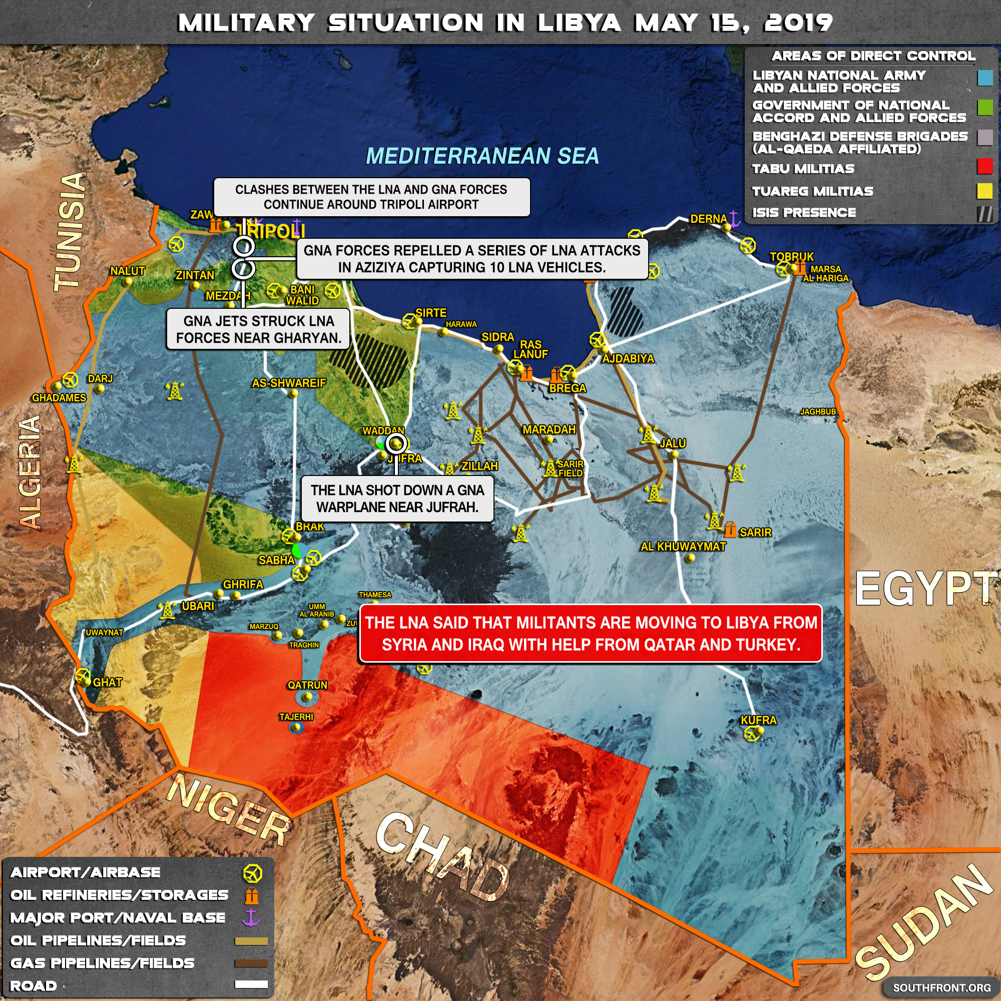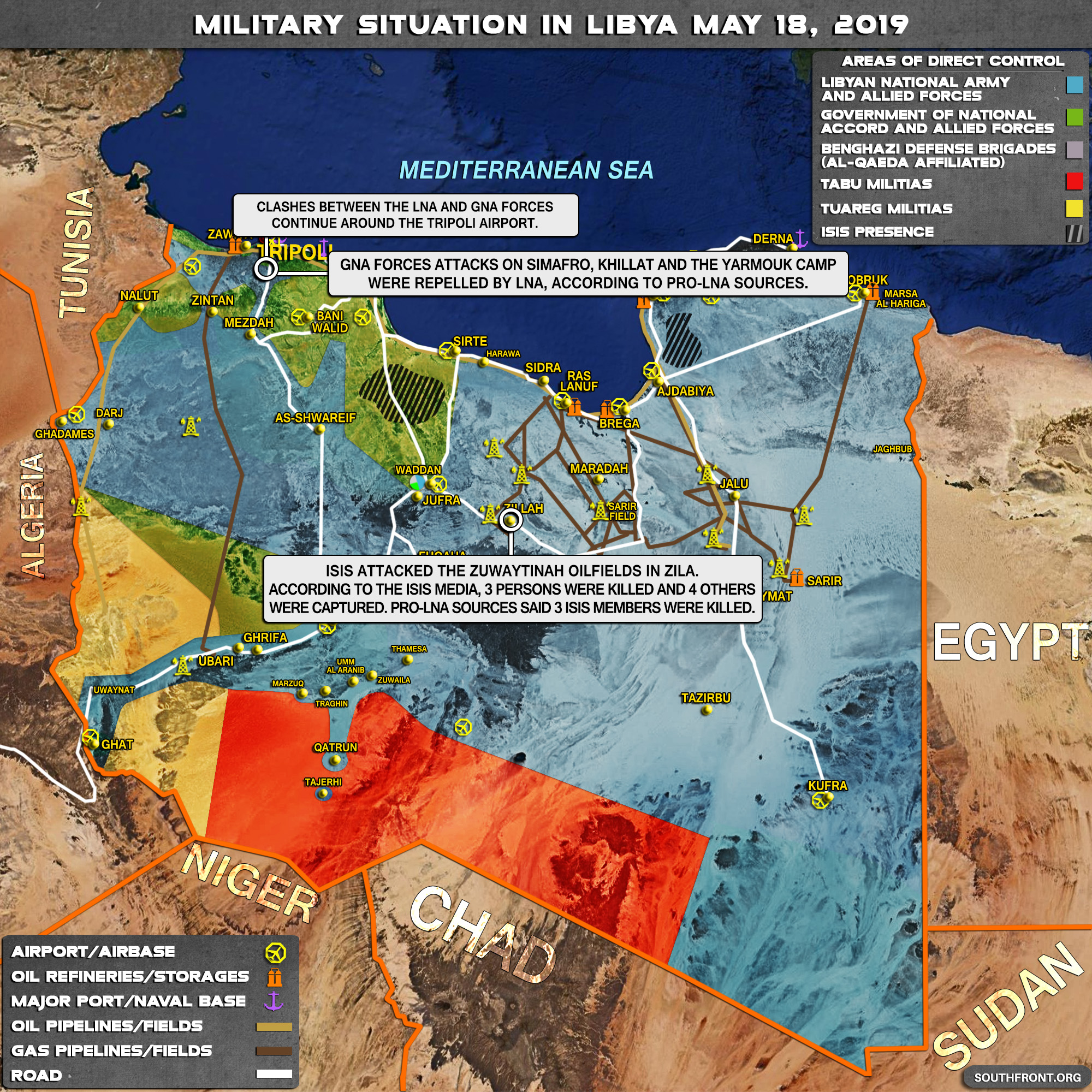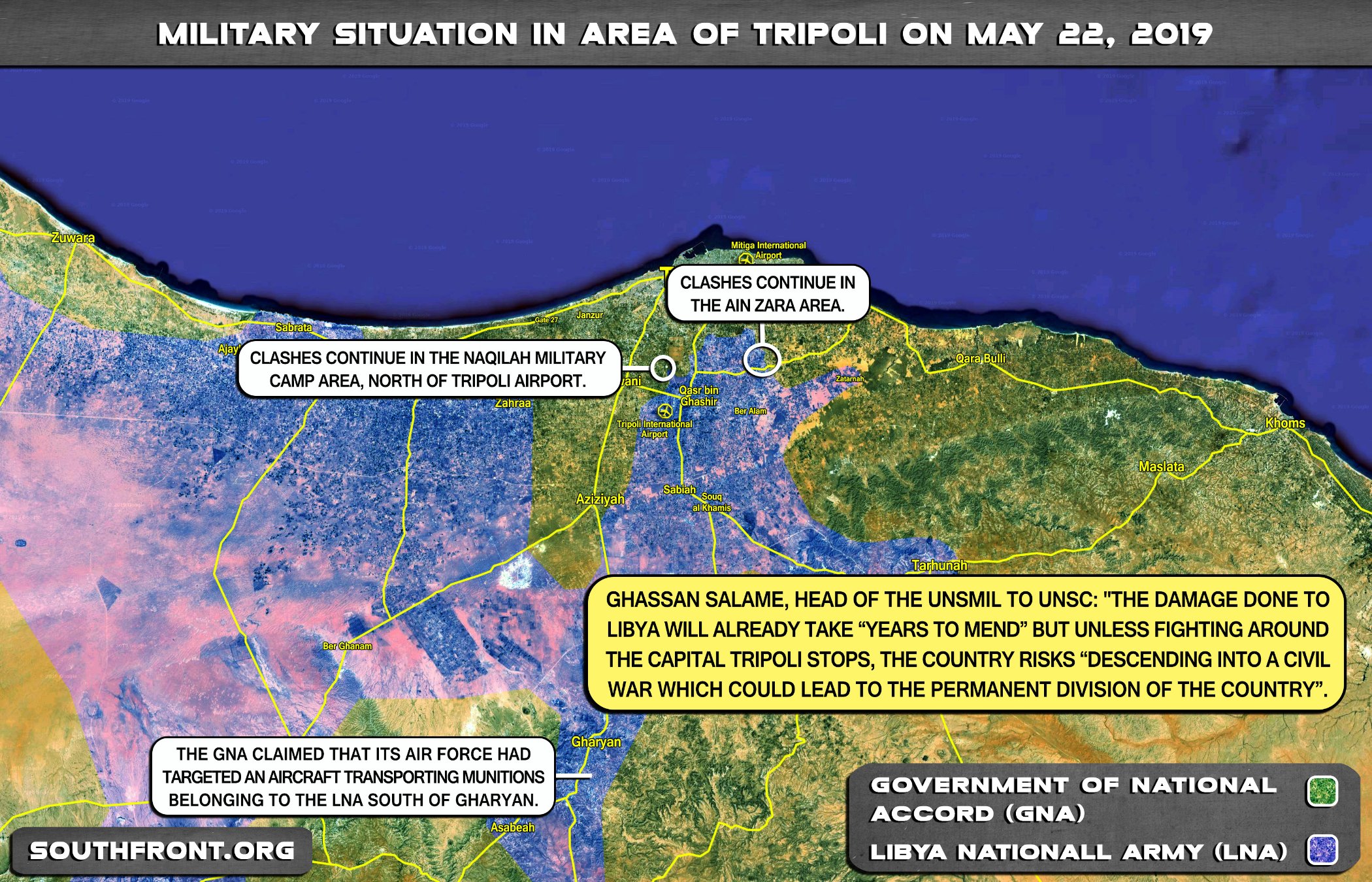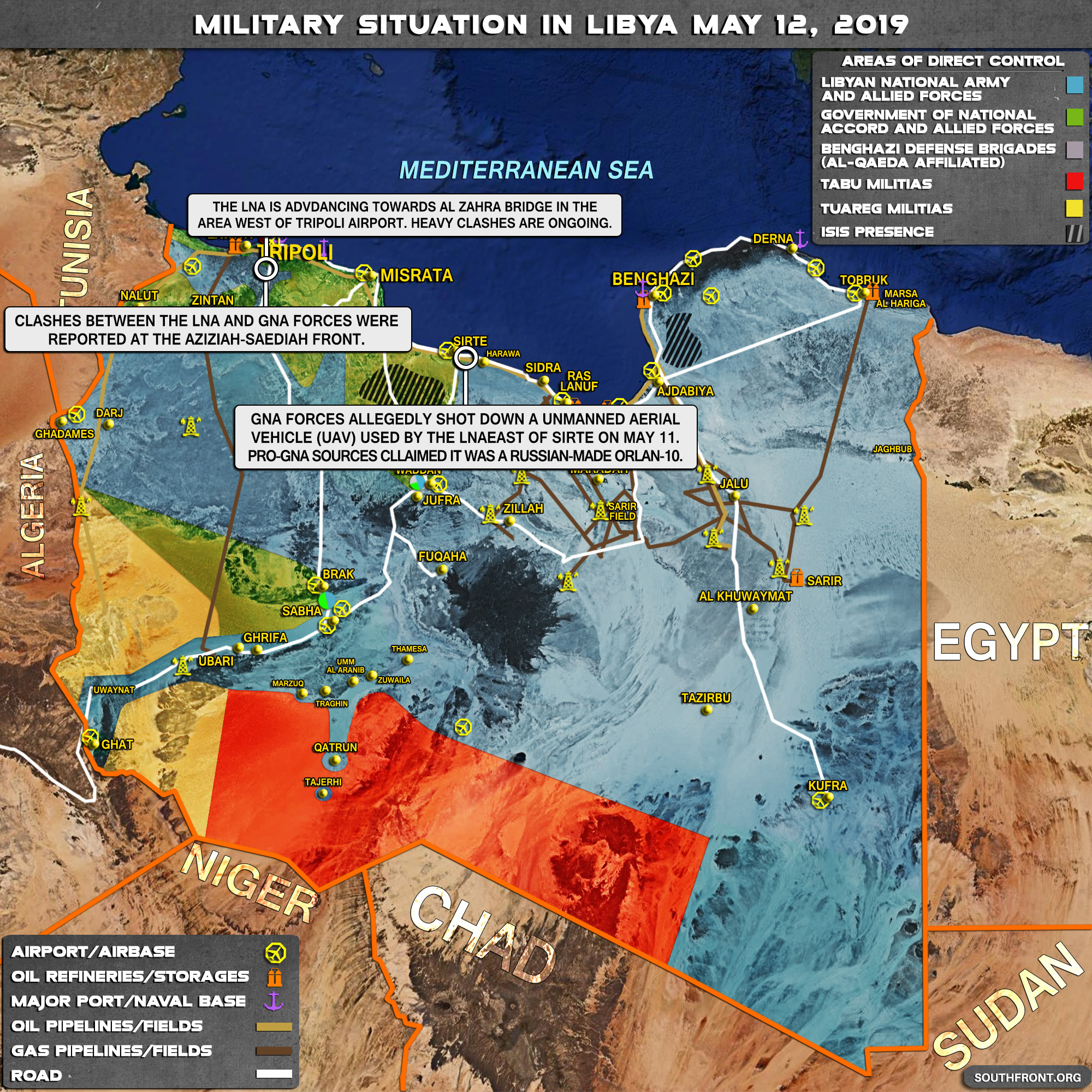 Síly vlády národní dohody (GNA) pokračují ve svých pokusech zastavit postup Libyjské národní armády (LNA) jižně od Tripolisu. Podle posledních zpráv probíhají střety mezi LNA a GNA v blízkosti Ain Zara, mezinárodního letiště Tripoli a Azaziyah. Swani zůstává klíčovou pevností GNA jihozápadně od Tripolisu. Pokud padne do rukou LNA, celá fronta GNA na jihozápadně by se mohl během několika dnů zhroutit. https://southfront.org/military-situati ... -2019-map/