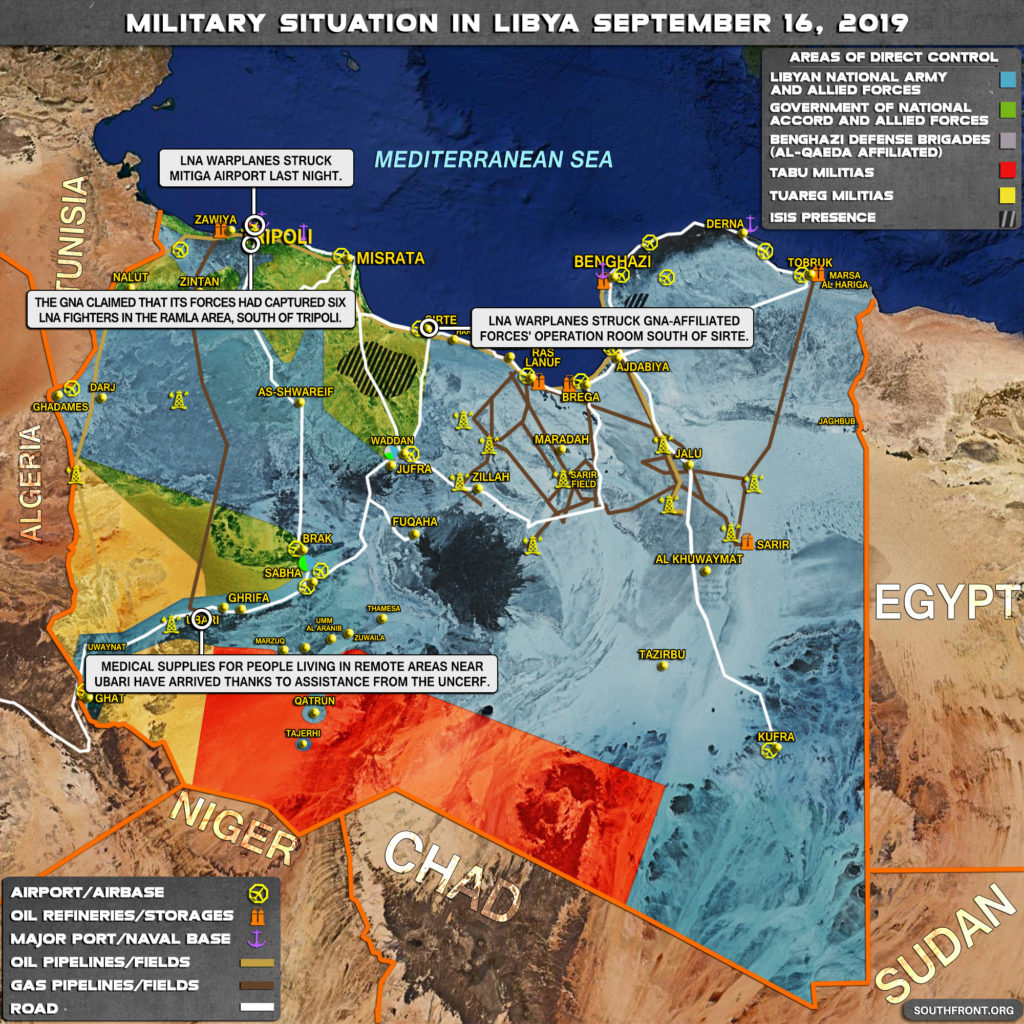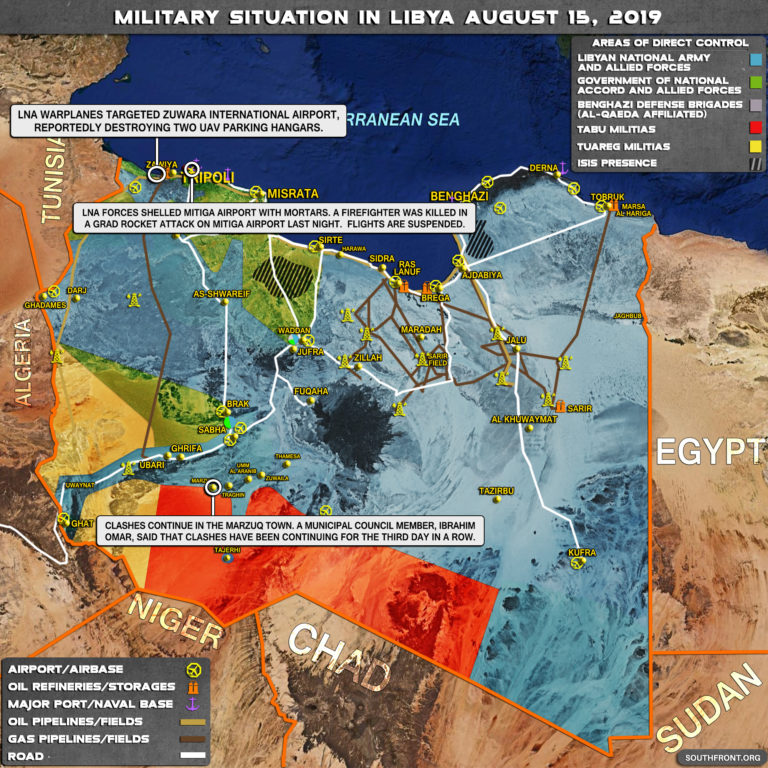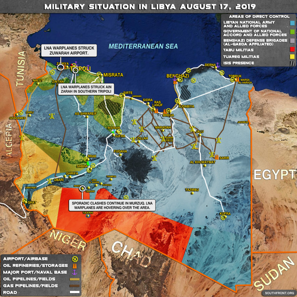 - LNA vojenská letadla zasáhla letiště Zuwarah. southfront.org/military-situation-in-libya-on-august-17-2019-map-update/