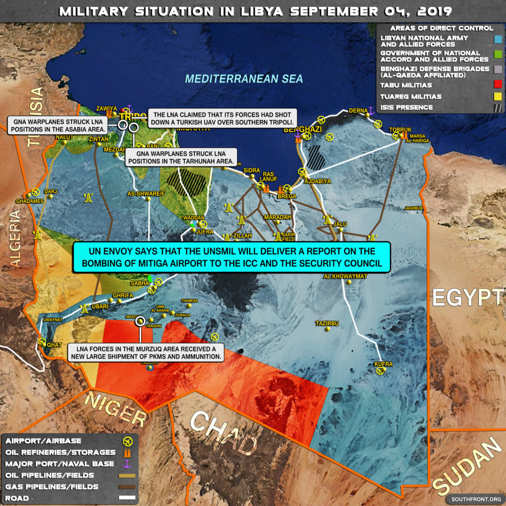 - Vyslanec OSN říká, že UNSMIL doručí ICC a Radě bezpečnosti zprávu o bombardování letiště Mitiga. https://southfront.org/map-update-milit ... er-4-2019/