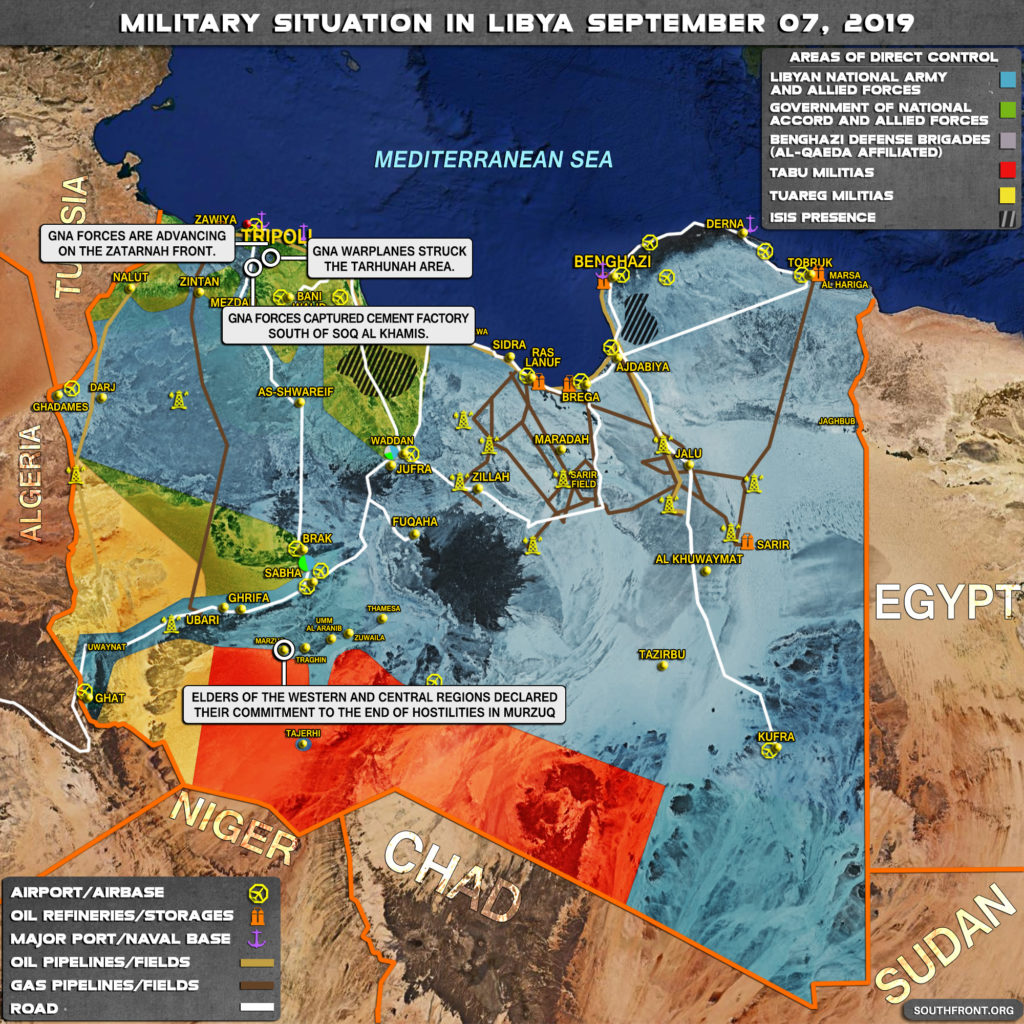 - GNA sdělila, že její síly zajaly šest bojovníků LNA v oblasti Ramla jižně od Tripolisu. https://southfront.org/map-update-milit ... r-16-2019/