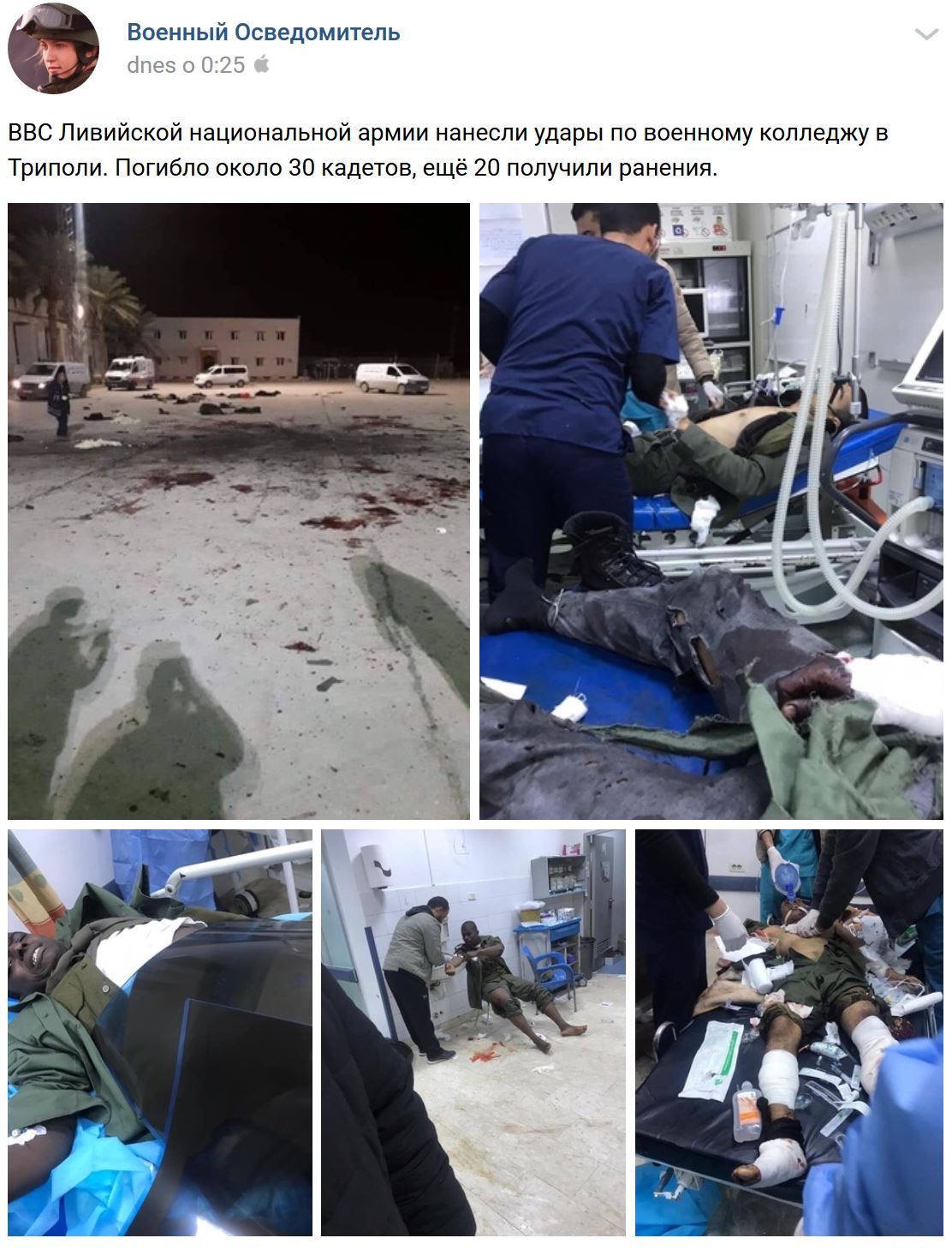 Vzdušné sily líbyjskej národnej armády napadli vojenskú vysokú školu v Tripolise. Asi 30 kadetov bolo zabitých a ďalších 20 bolo zranených. Zdroj https://vk.com/wall-123538639_1290978 z 05.01.2020