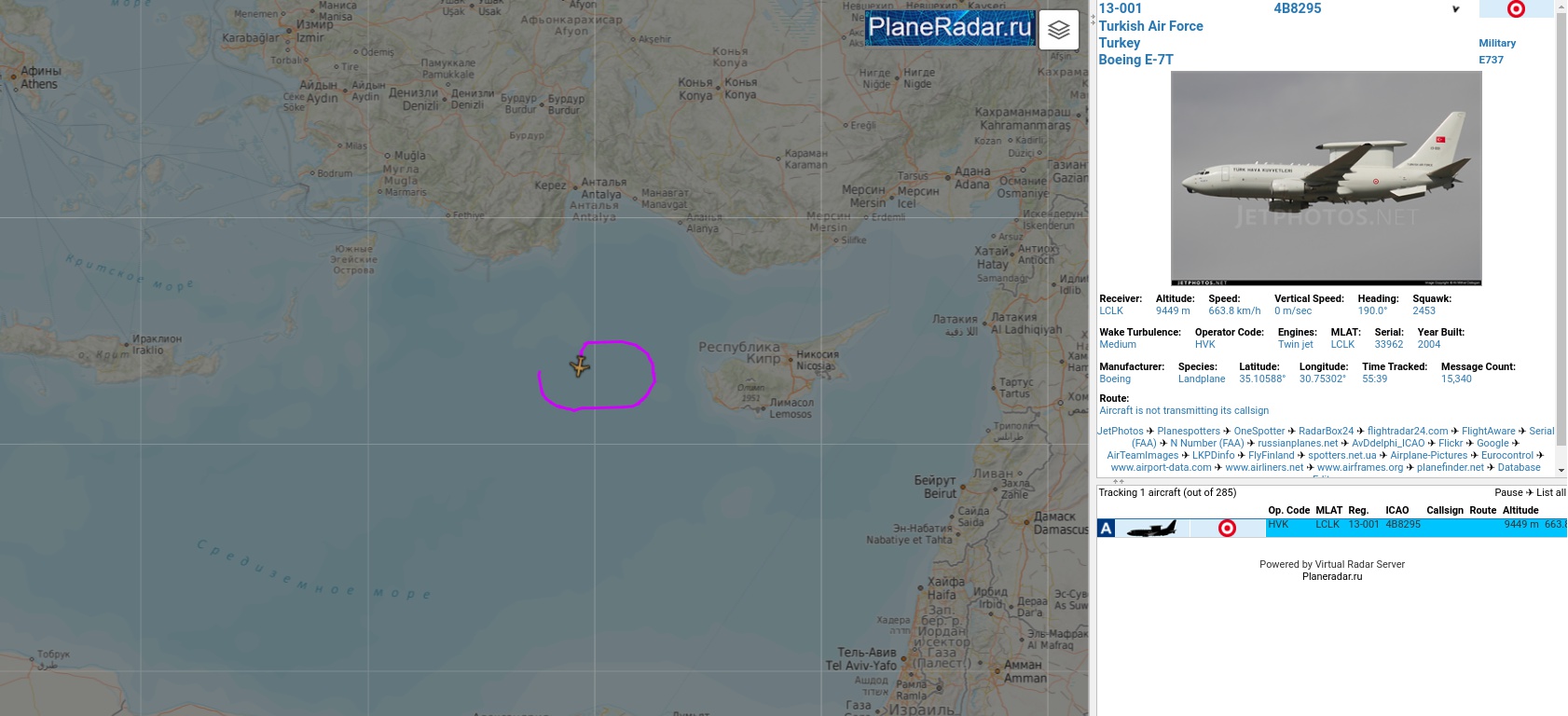 Turecký AWACS E-7T opět právě teď na své obvyklé hlídkovací pozici a pravděpodobně točí první otočku, kdy zrovna přiletěl, dnes je ve vzduchu číslo 33962, včera 33963, většinou se střídají.