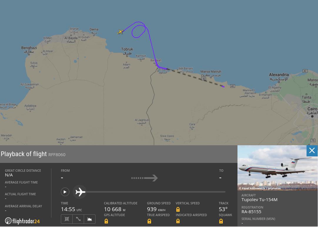 Tu-154M RA-85155 odlétá po 8h z Libye na Hmímim a 12 min. vyčkávaní severně od Tobruku