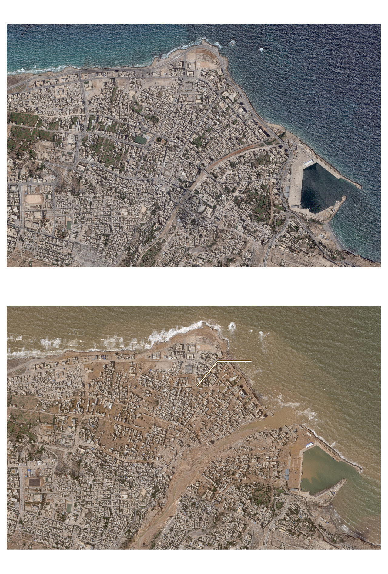Líbya, mesto Derna (cca 250km východne od Bengází), pred a po záplavách (pohľad z juhu na sever, "obzor" je Stredozemné more)