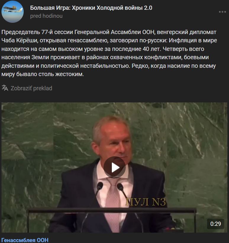 Predseda 77. zasadnutia Valného zhromaždenia OSN, maďarský diplomat Csaba Körösi, otvoril valné zhromaždenie prejavom v ruštine: Inflácia vo svete je najvyššia za posledných 40 rokov. 1/4 svetovej populácie žije v oblastiach sužovaných konfliktami, bojmi a politickou nestabilitou. Málokedy sa na svete vyskytlo toľko násilia.