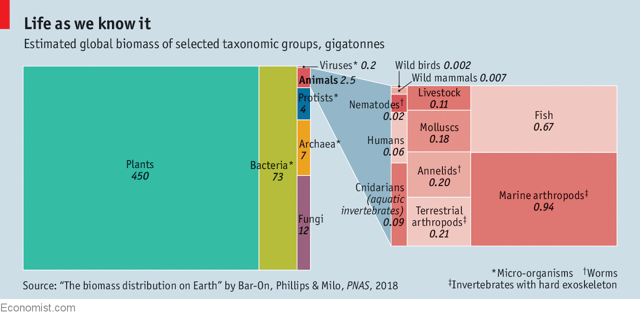 Prekvapivo, ľudia sa na nich podieľajú relatívne malou hmotnosťou v porovnaní so zvyškom živočíšnej ríše. Ľudia tvoria len 0,01 % všetkej biomasy na planéte.