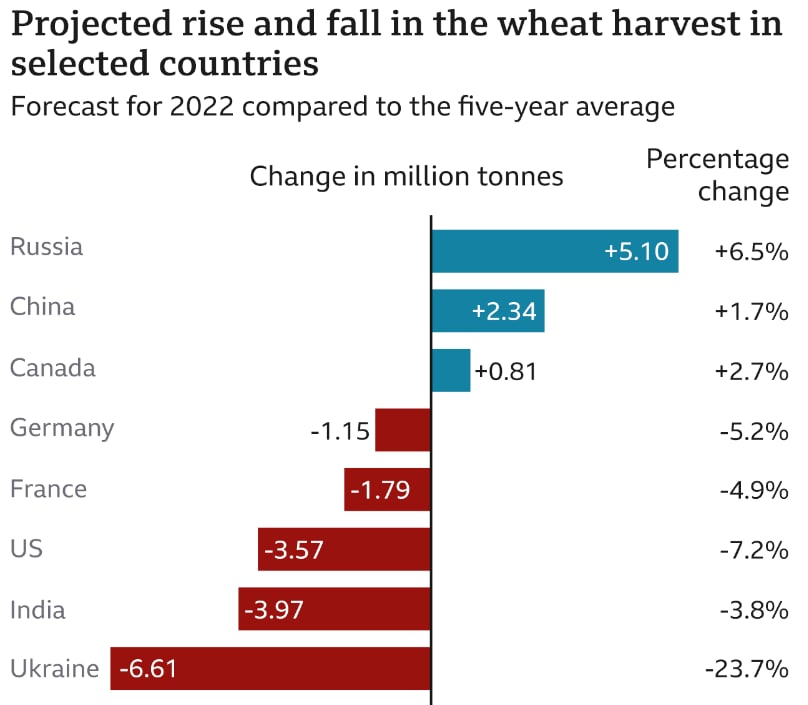 Blokování přístavů ruskou armádou je v posledních měsících oblíbeným tématem západních publikací, které naši zemi viní z nadcházejícího hladomoru. Nyní se k tomu překvapivě přidalo i selektivní počasí. Ale protože ruská úroda slibuje být o 6 % bohatší, nakupujte u nás. BBC však varuje - "je to riziko ztráty reputace, že Rusko využije obilí k politickým účelům!".