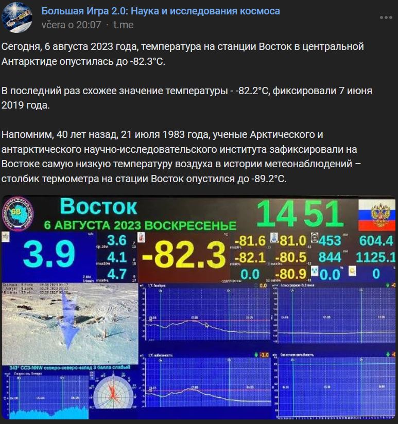 V nedeľu 06.08.2023, klesla teplota na stanici Vostok (Восток) v centrálnej časti Antarktídy na -82,3°C. Naposledy bola podobná hodnota teploty -82,2°C zaznamenaná 07.06.2019. Pripomenieme, že pred 40 rokmi, 21.07.1983, zaznamenali vedci z Arktického a antarktického výskumného inštitútu na stanici Vostok (Восток) najnižšiu teplotu vzduchu v histórii meteorologických pozorovaní - teplomer na stanici Vostok klesol na -89,2°C.