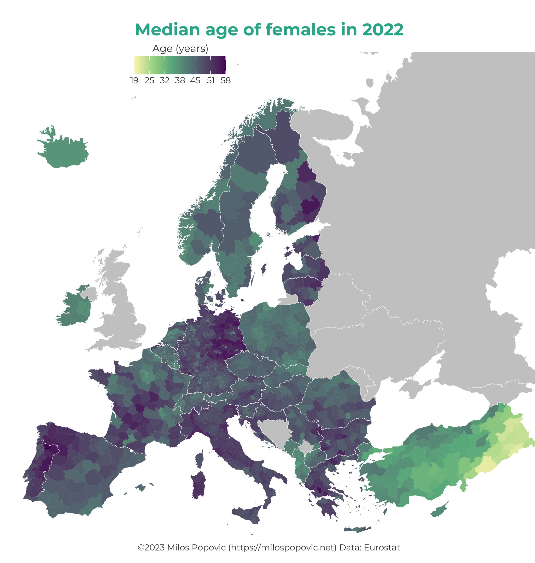 obrazok priemerneho presnejšie medianoveho veku žien v EU. Zaujimave je sa pozriet na Nemecko. Byvala NDR je tmava okrem Berlina, kde je kopec pristahovalcov. Rovnako je to aj pri velkych nemeckych mestach. No pobalstke "vymieraty" su tmave kak batinky.