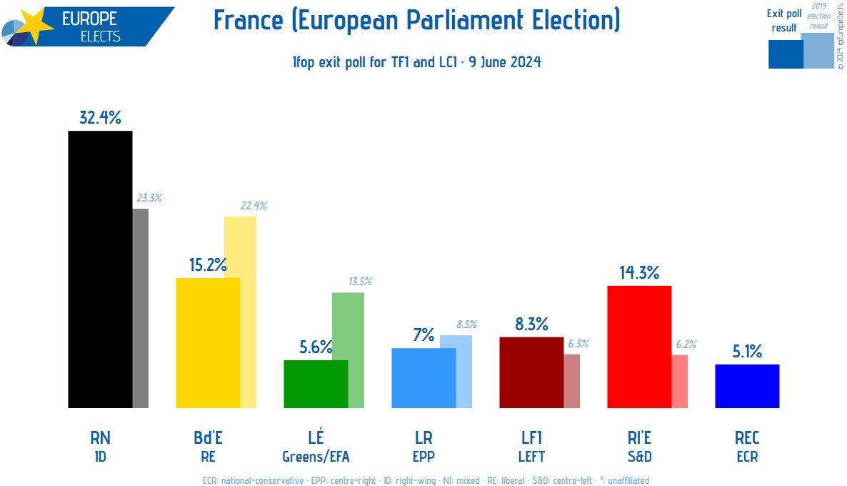 Výsledky voleb do Evropského parlamentu ukazují prudký nárůst popularity pravice. Národní shromáždění Marine Le Penové získalo ve Francii 32-33 % hlasů. Macronova strana Renesance je (https://twitter.com/EuropeElects/status ... 3449784737) silně pozadu a získala o polovinu méně hlasů.
