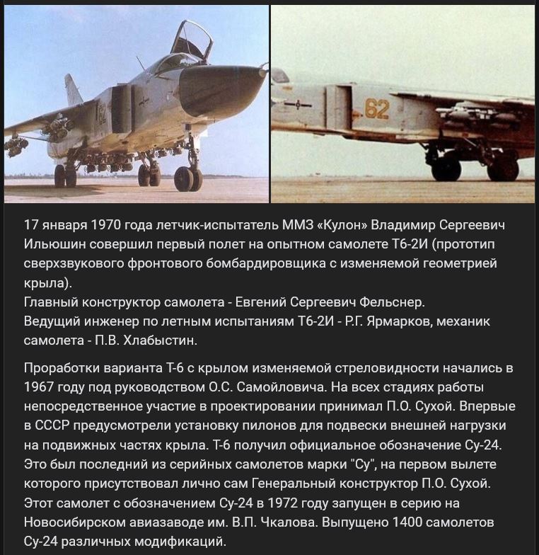 17.01.1970 = pred 55 rokmi skúšobný / testovací pilot MMZ Kulon (ММЗ Кулон) Vladimir Sergejevič Iľjušin (Владимир Сергеевич Ильюшин) uskutočnil prvý let na prototype lietadla T6-2I (Т6-2И) (prototyp nadzvukového frontového bombardéra s meniteľnou geometriou krídla). Hlavným konštruktérom lietadla bol Jevgenij Sergejevič Feľsner (Евгений Сергеевич Фельснер). Vedúcim inžinierom letových skúšok T6-2I (Т6-2И) bol R. G. Jarmarkov (Р.Г. Ярмарков), mechanikom lietadla bol P. V. Chlabystin (П.В. Хлабыстин). Vývoj variantu T-6 s meniteľnou geometriou krídel sa začal v roku 1967 pod vedením O. S. Samojloviča (О.С. Самойловича). Vo všetkých fázach prác sa na konštrukcii priamo podieľal P. O. Suchoj (П.О. Сухой). Prvýkrát v ZSSR (СССР) sa počítalo s inštaláciou pylónov na vonkajšie zavesenie výzbroje na pohyblivé časti krídla. T-6 dostal oficiálne označenie Suchoj Su-24 (Су-24). Toto bolo posledné zo sériových lietadiel značky Suchoj "Su", na ktorého prvom lete sa osobne zúčastnil sám generálny konštruktér P. O. Suchoj (П.О. Сухой). Toto lietadlo s označením Suchoj Su-24 (Су-24) sa od roku 1972 začalo vyrábať v Novosibírskom leteckom závode V. P. Čkalova. Bolo vyrobených 1 400 lietadiel rodiny Su-24 (rôznych modifikácií).