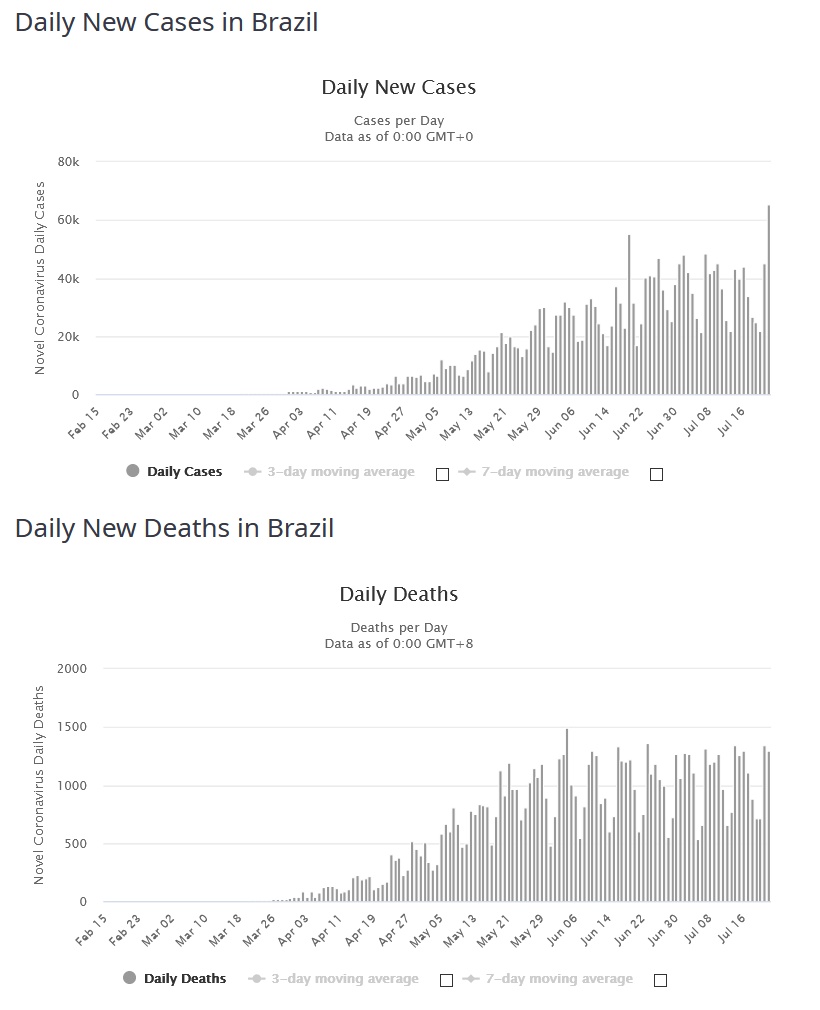 Brazílsky zdravotný systém zrejme kolabuje - opakovane viac ako tisíc mrtvych denne mali len briti medzi 7. - 24. aprilom 2020 - a samozrejme američania (a dva krát už aj Mexiko), závažné je aj zvýšnie počtu novo infikovaných z 20-40 tisíc denne na bezmála 60 tisíc v posledných troch dňoch (18.7.-26k; 19.-24k; 20.-22k; 21.-45k; 22.7.- 65k; 23.-58k; 24.-58k)