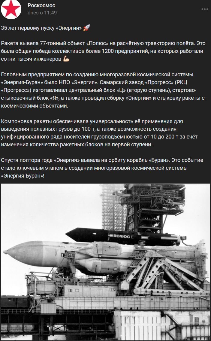 15.05.1987 = pred 35-timi rokmi, prvý štart nosnej rakety Energia (Энергия), ktorá dokázala na nízku dráhu vyniesť 100 ton (prvý náklad Poljus (Полюс) mal 77 ton)