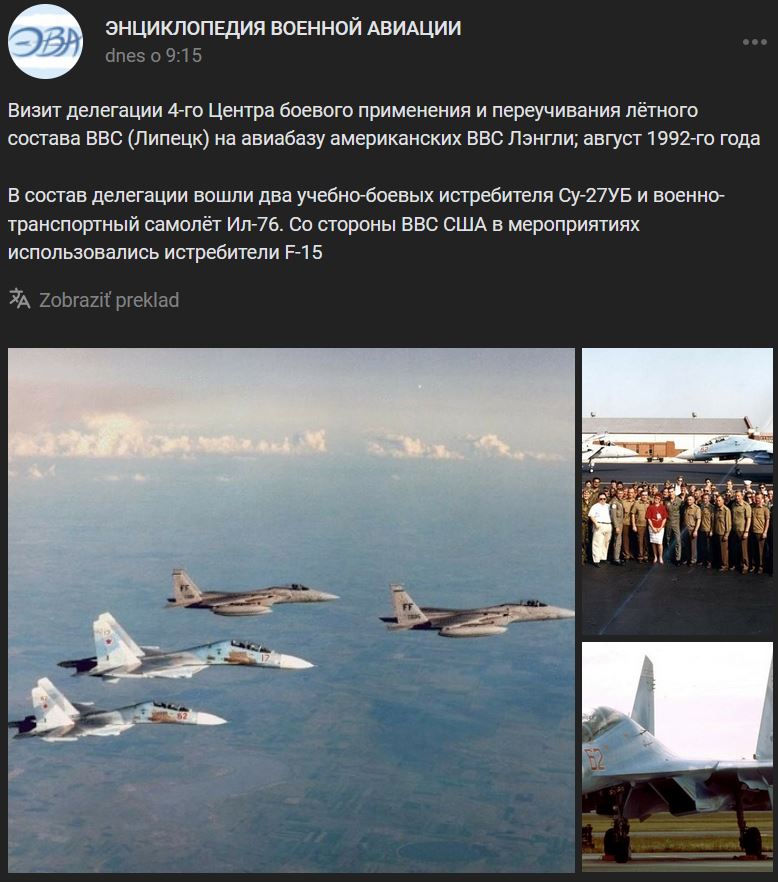 Návšteva delegácie zo 4. Centra bojového výcviku vzdušných síl (Lipeck/Липецк) na leteckej základni amerických VVS Langley v 08/1992. V zostave delegácie boli 2 cvično-bojové lietadlá Suchoj Su-27UB (Су-27УБ) a vojenské transportné lietadlo Iľjušin IL-76 (Ил-76). Zo strany VVS SŠA boli pri akciách použité lietadlá F-15. Zdroj https://477768.livejournal.com/3560413.html / https://vk.com/wall-173678697_280377 z 17.08.2022 + lepšie foto + foto v diskusii