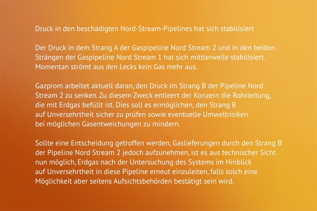O pár dnů později oznámil Novak, že Rusko má možnost dodávat plyn do Evropy skrze nepoškozenou větev NS2 plynovodu. Ale i poškozená část je opravitelná a až bude v pořádku, po skončení právních jednání na evropské straně a na základně odstranění sankcí, bude Rusko schopno doručovat do Evropy potřebné množství plynu.