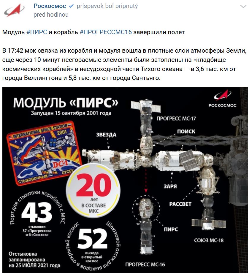 táto dvojica (Progress MS-16 + Pirs) vleteli do atmosféry o cca 17:42 MSK a do 10 minút zhoreli, ťažké kusy ktoré vydržali prechod atmosférou dopadli na "cintorín kozmických lodí" v Tichom oceáne = 3600km od mesta Wellington (Nový Zéland) a 5800km od mesta Santiago (Čile) + z diskusie prelet cez atmosféru s parametrami foto:
