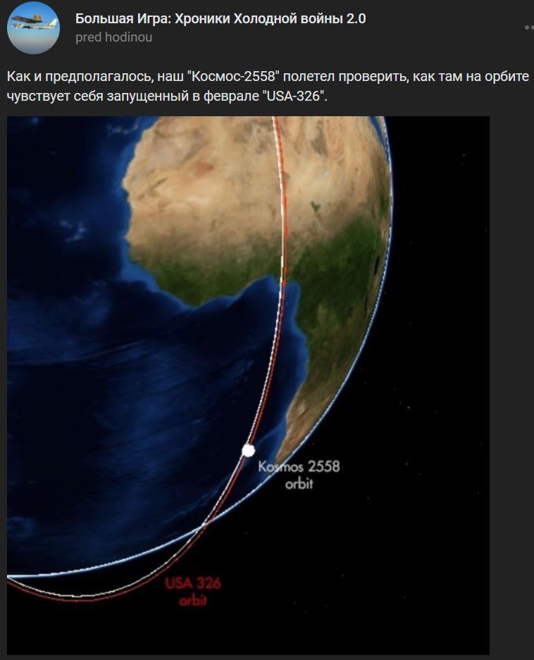 Ako sa dalo očakávať, náš Kosmos-2558 (Космос-2558) letel preveriť / skontrolovať družicu USA-326 vypustenú v 02/2022, ako sa jej darí na obežnej dráhe.