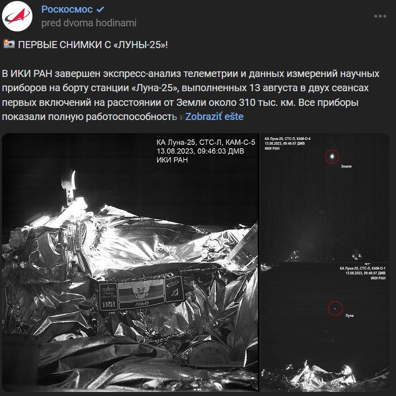 V IKI RAN (ИКИ РАН) dokončili expresnú analýzu telemetrických a meracích údajov vedeckých prístrojov na palube stanice Luna-25, ktorá sa uskutočnila v nedeľu 13.08.2023 v dvoch reláciách prvých aktivácií vo vzdialenosti od Zeme približne 310 tisíc km. Všetky prístroje preukázali plnú funkčnosť a pripravenosť na výskum Mesiaca. Ich analógové a digitálne uzly a bloky pracovali "perfektne" ("otlično"). Kamery na pulube STS-L (СТС-Л) urobili prvé zábery z vesmíru, ktoré sa zapíšu do histórie národnej kozmonautiky. Tieto zábery zobrazujú prvky konštrukcie kozmickej lode na pozadí Zeme, z ktorej sme už navždy odleteli, a na pozadí Mesiaca, na ktorý čoskoro dorazíme. Tretí obrázok zobrazuje emblém misie a vedro/kôš palubného manipulátora. Zdroj z 14.08.2023 + kvalitnejšie foto